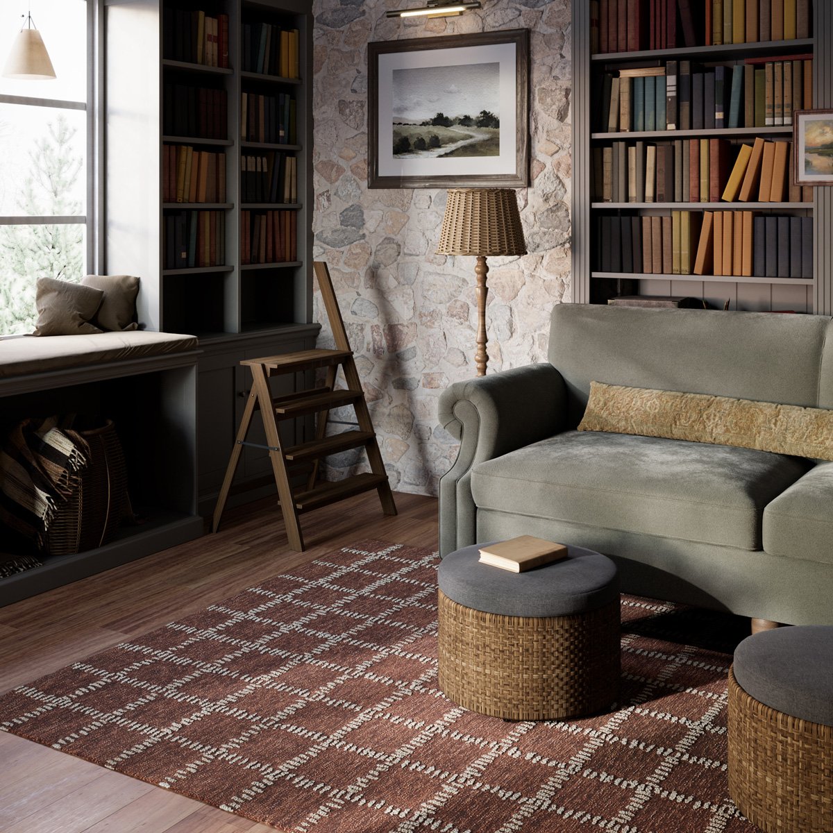 落ち着いたブリック色が◎。ほっこり&クラシカルラグ Mahina を敷くと、空間にちょうどいい温もり感が加わりますよ。
