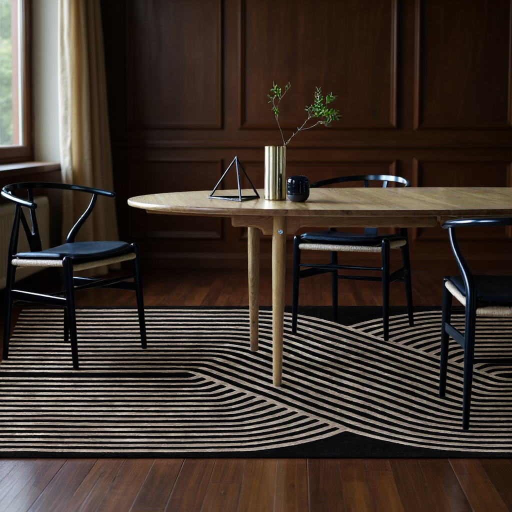 美しいカーブに思わず引き込まれそうになる、大胆なジオメトリックデザインが素敵な、ウール&ビスコース製ハンドタフトラグ Taavi。