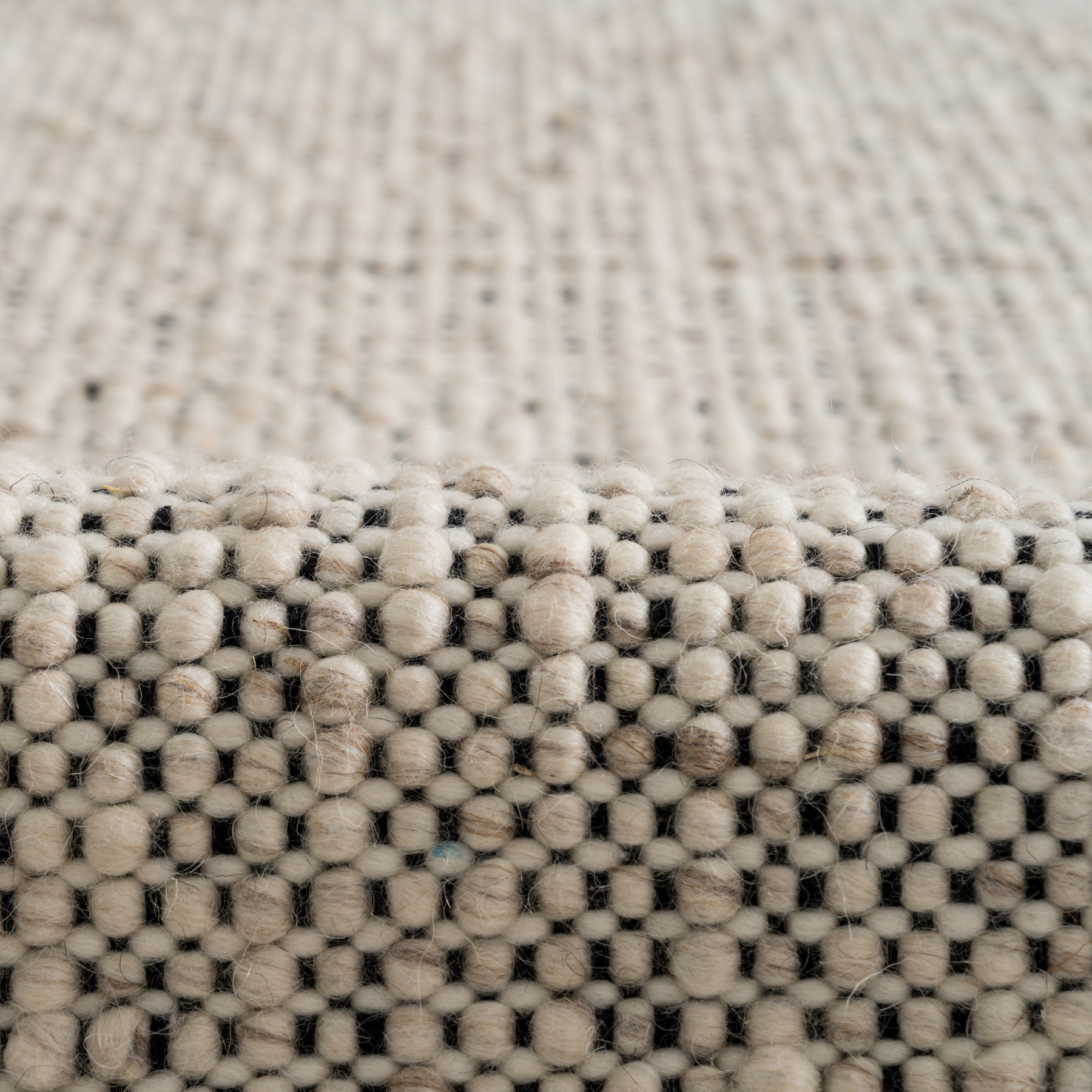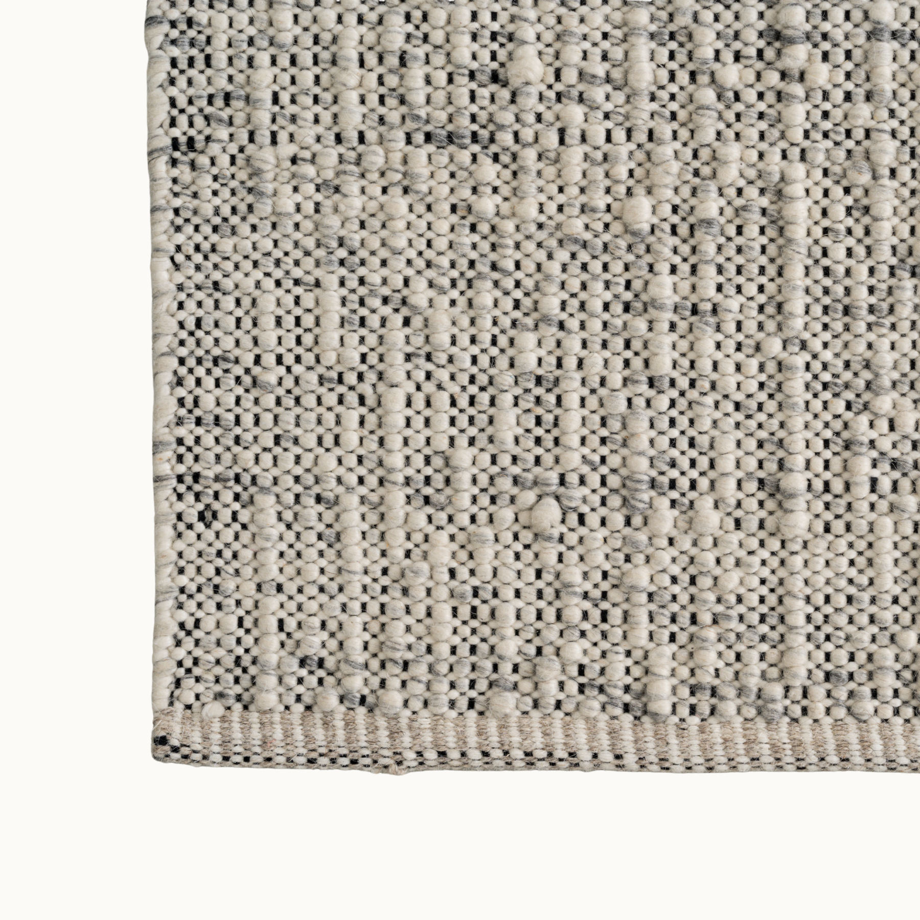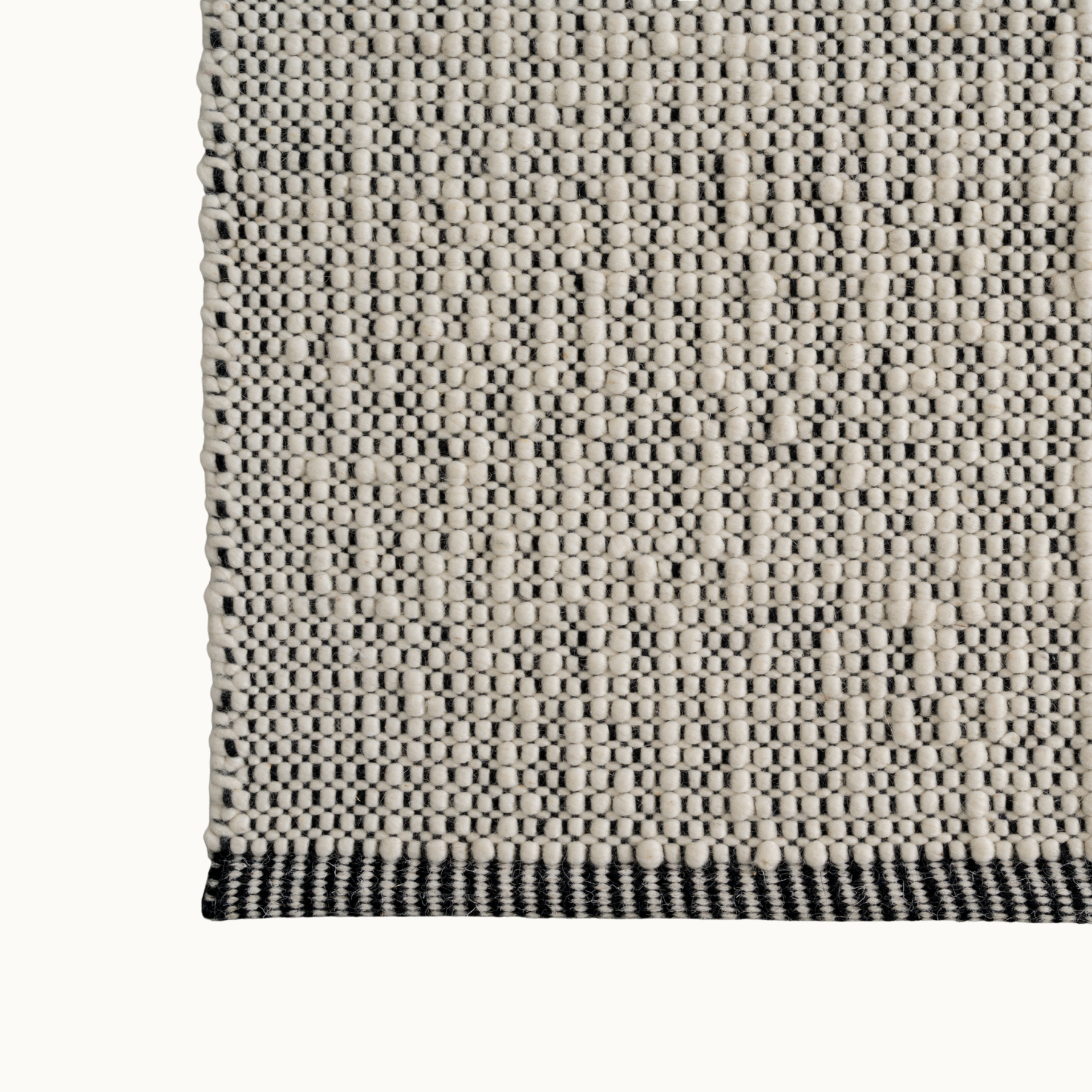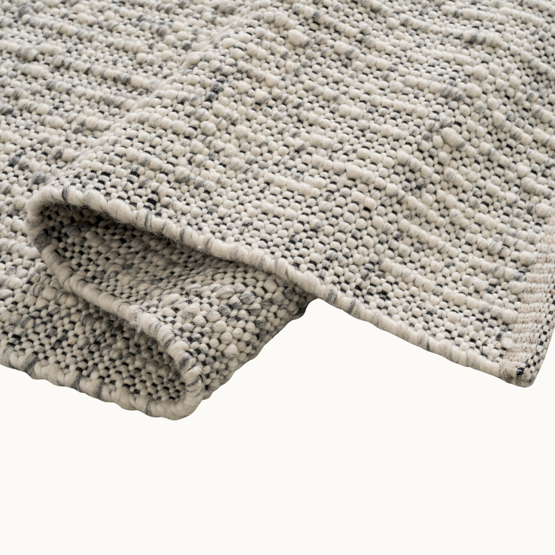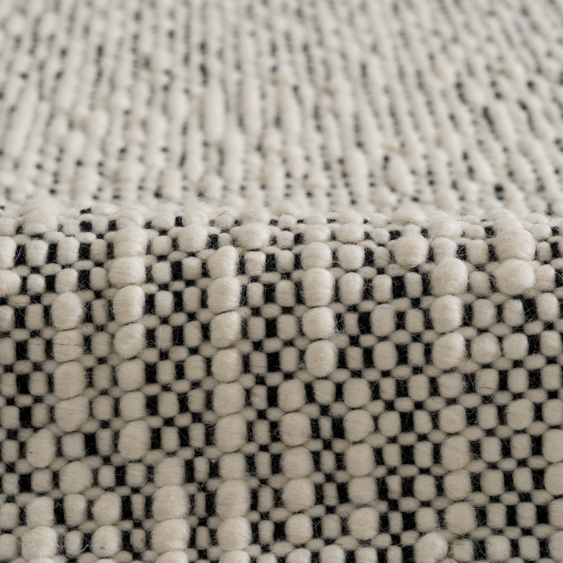 丸みを帯びた織りのリズムが心地よく、シンプルなモノトーンながら豊かな表情で、空間をやわらかく引き締めます。