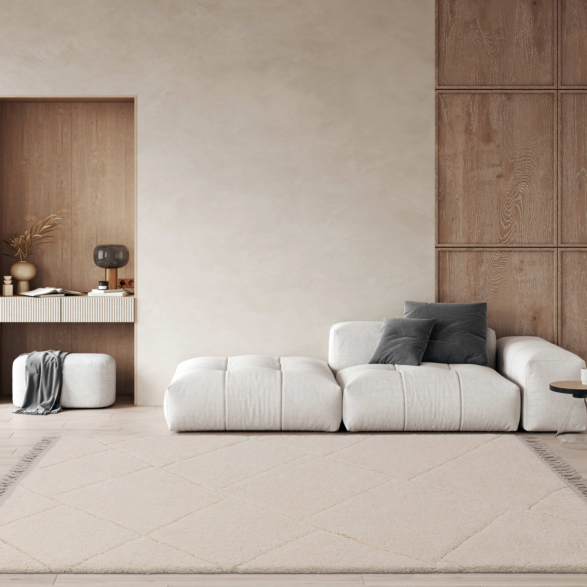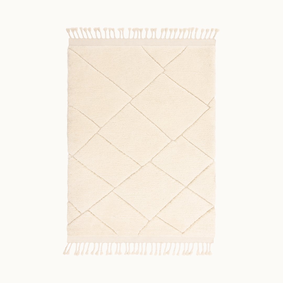 200x300cm大きめサイズの伝統的なベルベルキリムのテクスチャーやデザインにインスパイアされて織り上げた、ふわふわとした柔らかなマイクロファイバーポリエステル製RUGHAUSのベージュ・アイボリー色のベニワレンスタイルモロッカンラグ