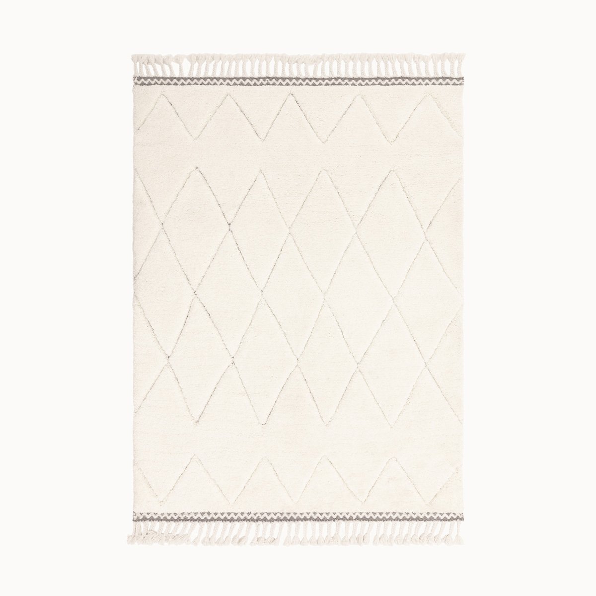 160x230cmサイズの伝統的なベルベルキリムのテクスチャーやデザインにインスパイアされて織り上げた、ダイヤ模様がチャーミングな、ふわふわとした柔らかなマイクロファイバーポリエステル製RUGHAUSのベージュ・アイボリー色のベニワレンスタイルモロッカンシャギーラグ
