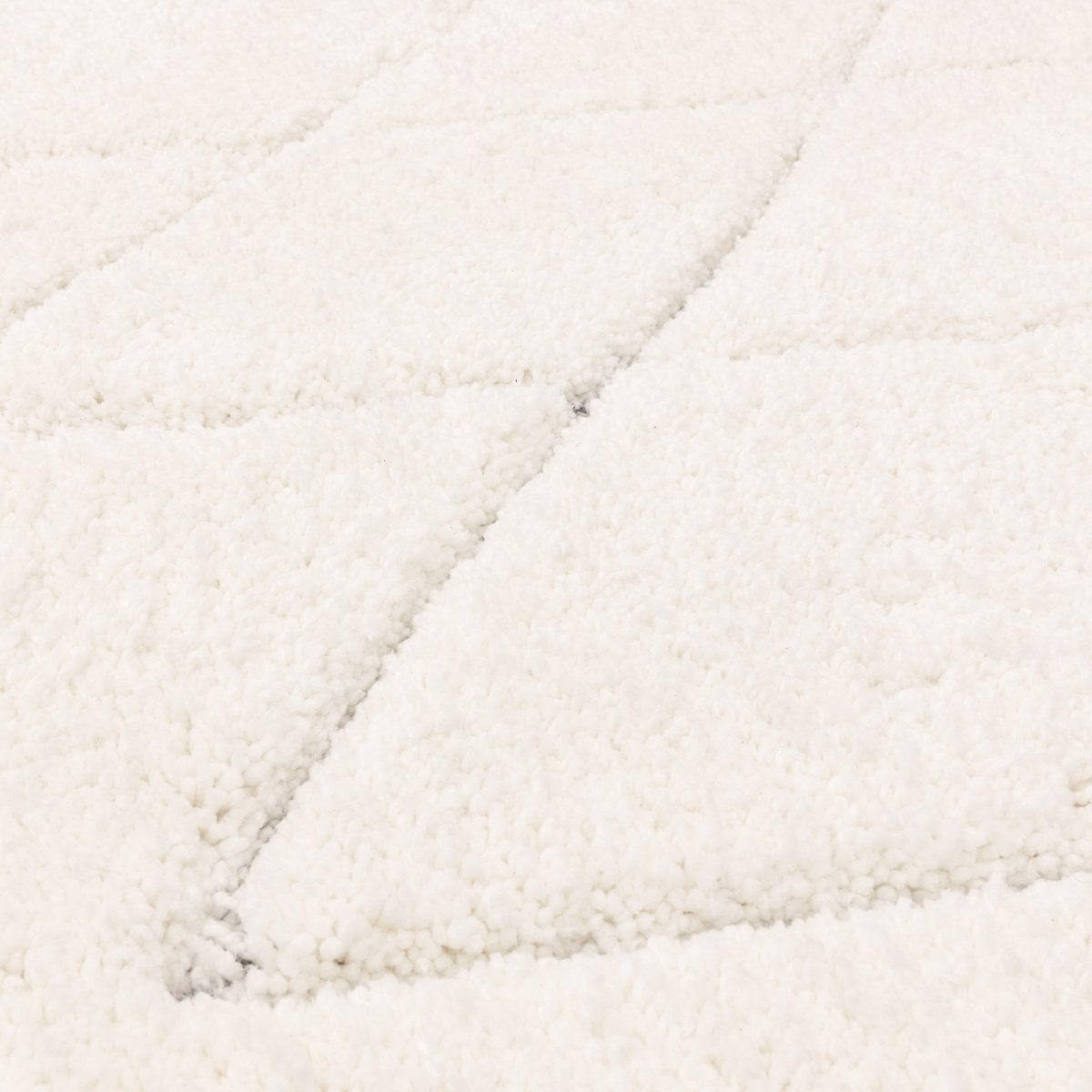伝統的なベルベルキリムのテクスチャーやデザインにインスパイアされて織り上げた、ダイヤ模様がチャーミングな、ふわふわとした柔らかなマイクロファイバーポリエステル製RUGHAUSのベージュ・アイボリー色のベニワレンスタイルモロッカンシャギーラグの素材感がわかるクロースアップ