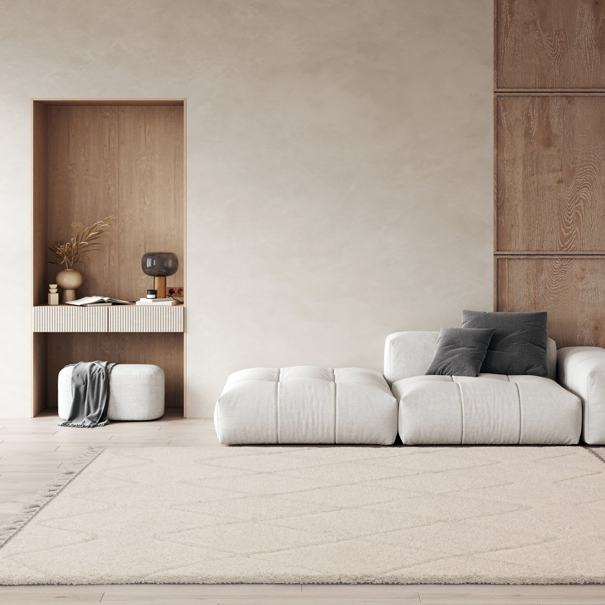 伝統的なベルベルキリムのテクスチャーやデザインにインスパイアされて織り上げた、ダイヤ模様がチャーミングな、ふわふわとした柔らかなマイクロファイバーポリエステル製RUGHAUSのベージュ・アイボリー色のベニワレンスタイルモロッカンシャギーラグを主役にした北欧モダンなリビングルーム