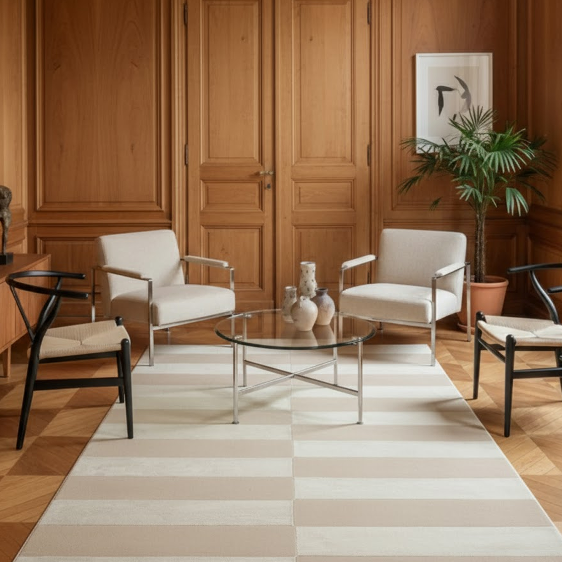 さりげない色調のグラデーションが空間に奥行きを生み出し、ブロック模様がモダンな印象のベーシックラグNilsan。