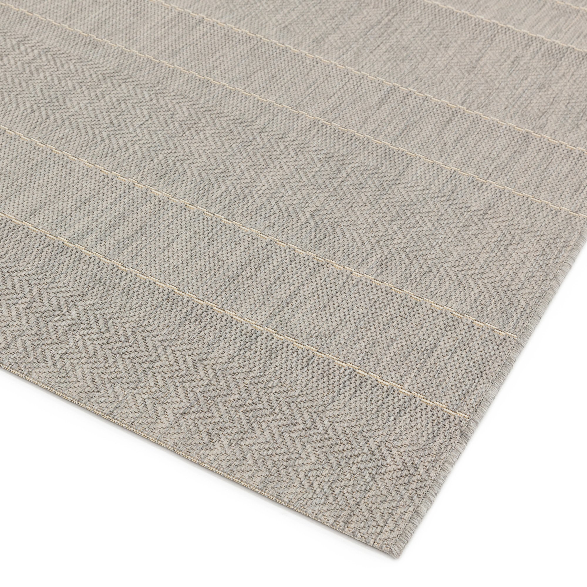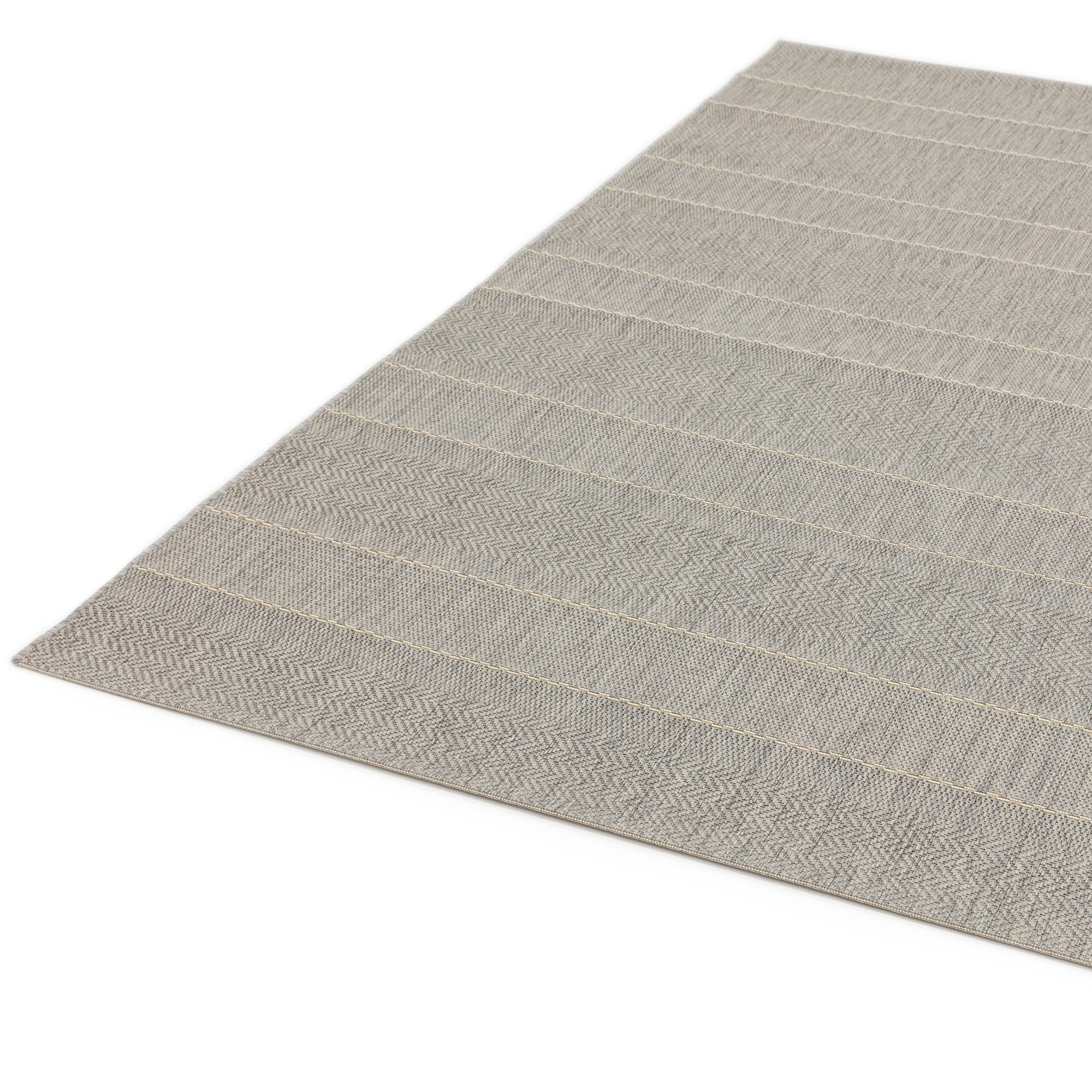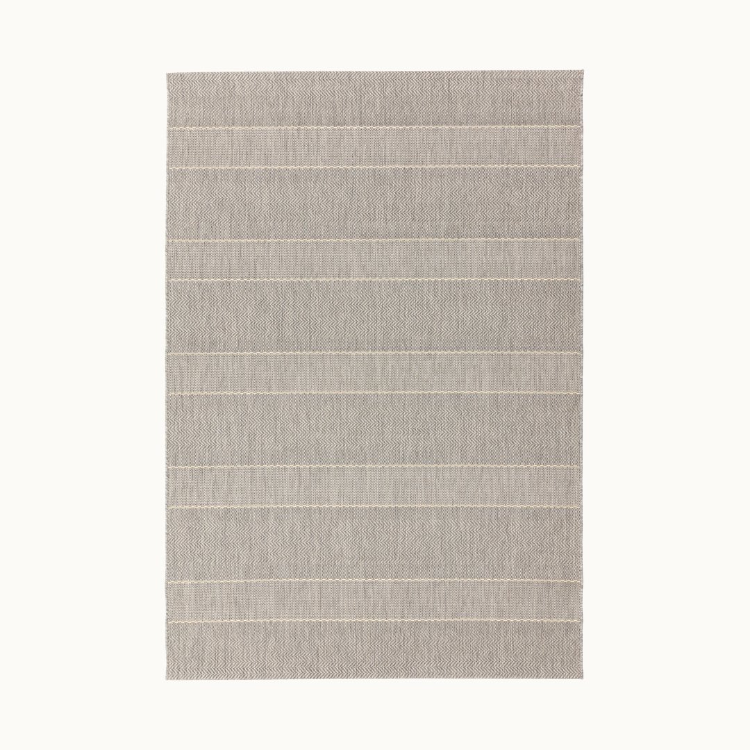 インドア・アウトドア兼用のナチュラルシックなライトグレーのラグ。ヘリンボーンのボーダーデザインがスタイリッシュ。