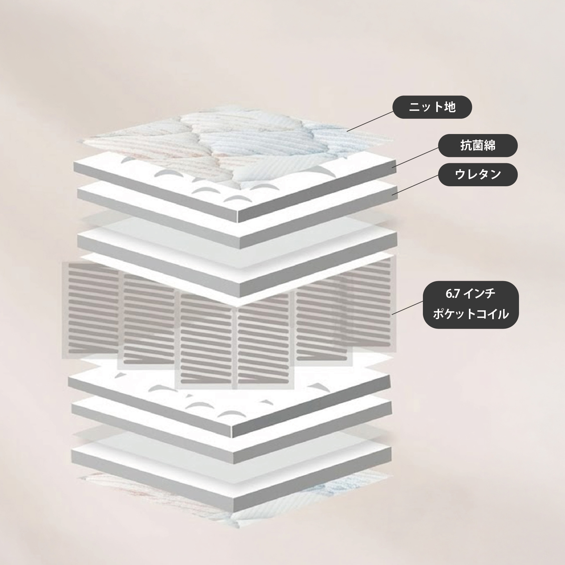ポケットコイル・ウレタン・抗菌綿・ニット地の多層構造。清潔さと快適さを両立しています。
