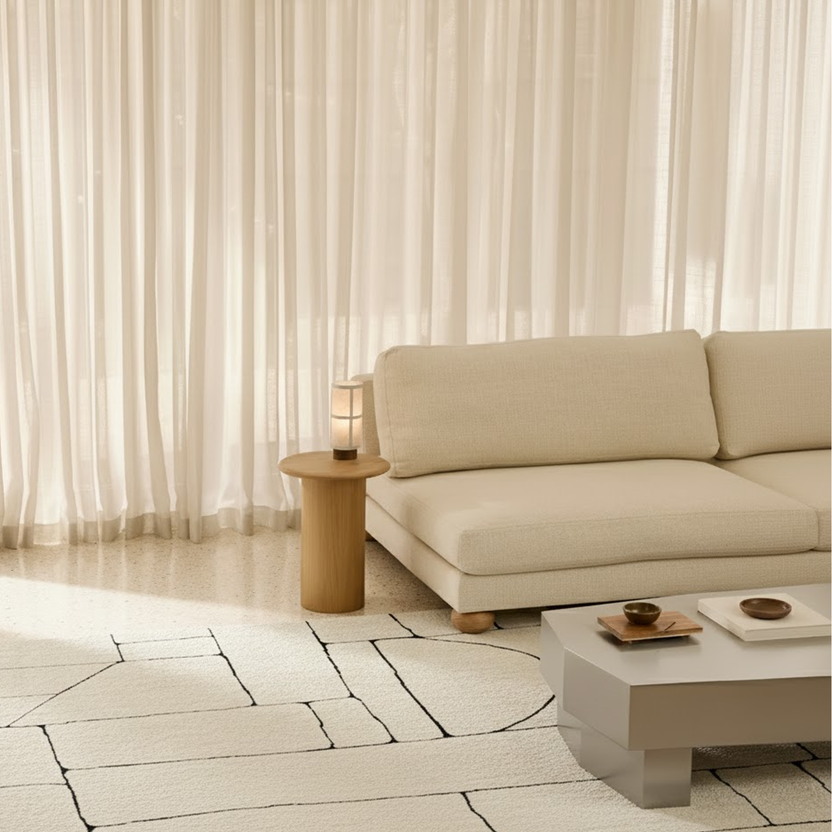 ラフに描かれた直線や曲線がチャーミングな、アイボリーのニュートラルなトーンで仕上げた、RUGHAUSのふんわりベーシックラグ Odilを主役にした白を基調としたナチュラルモダンなリビングルーム
