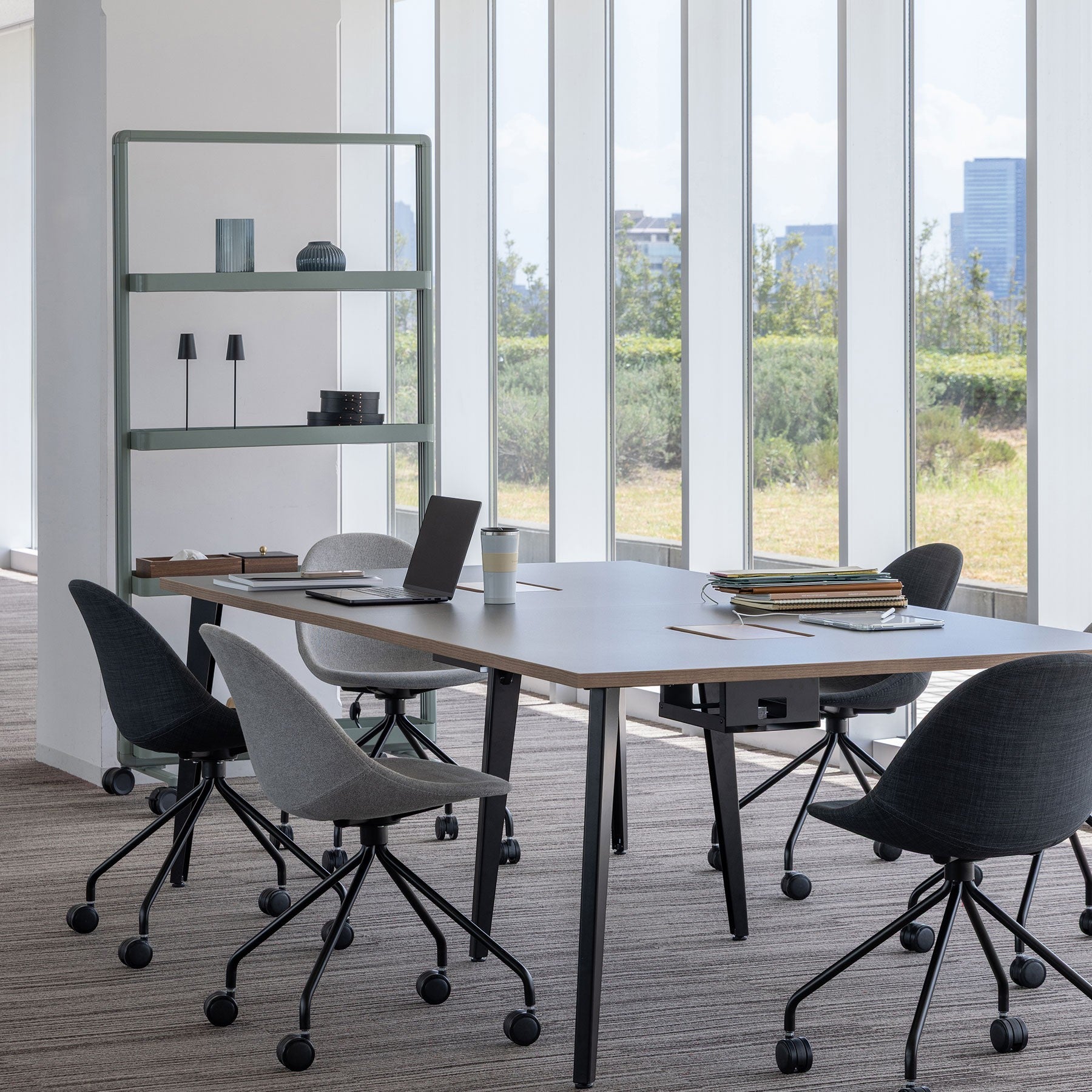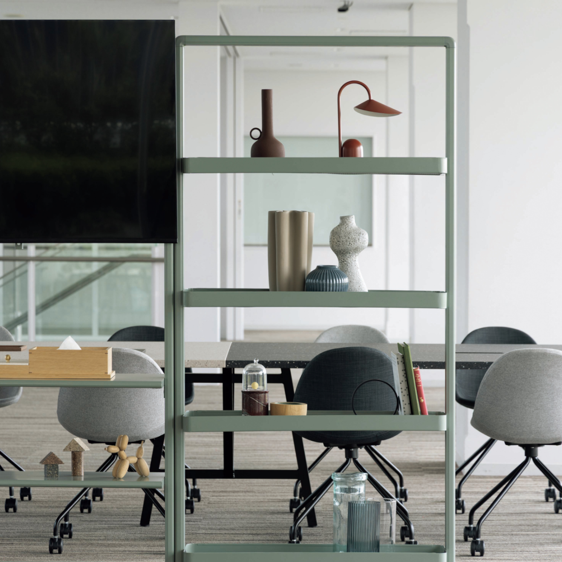 キャスター付きで移動がしやすく、レイアウト変更や用途の切り替えにも柔軟に対応します。オープンな収納として使うことで、作業効率を高めながら空間にリズムを生み出し、オフィスや共有スペースに自然な軽快さを添えます。