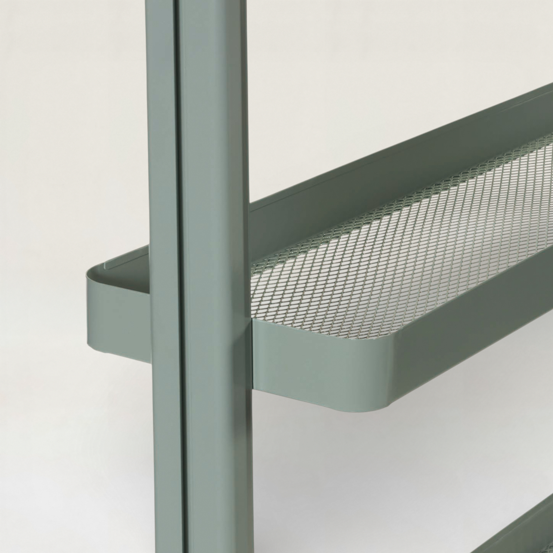 シャープなフレームラインが印象的な、軽やかさのあるスチールシェルフです。
