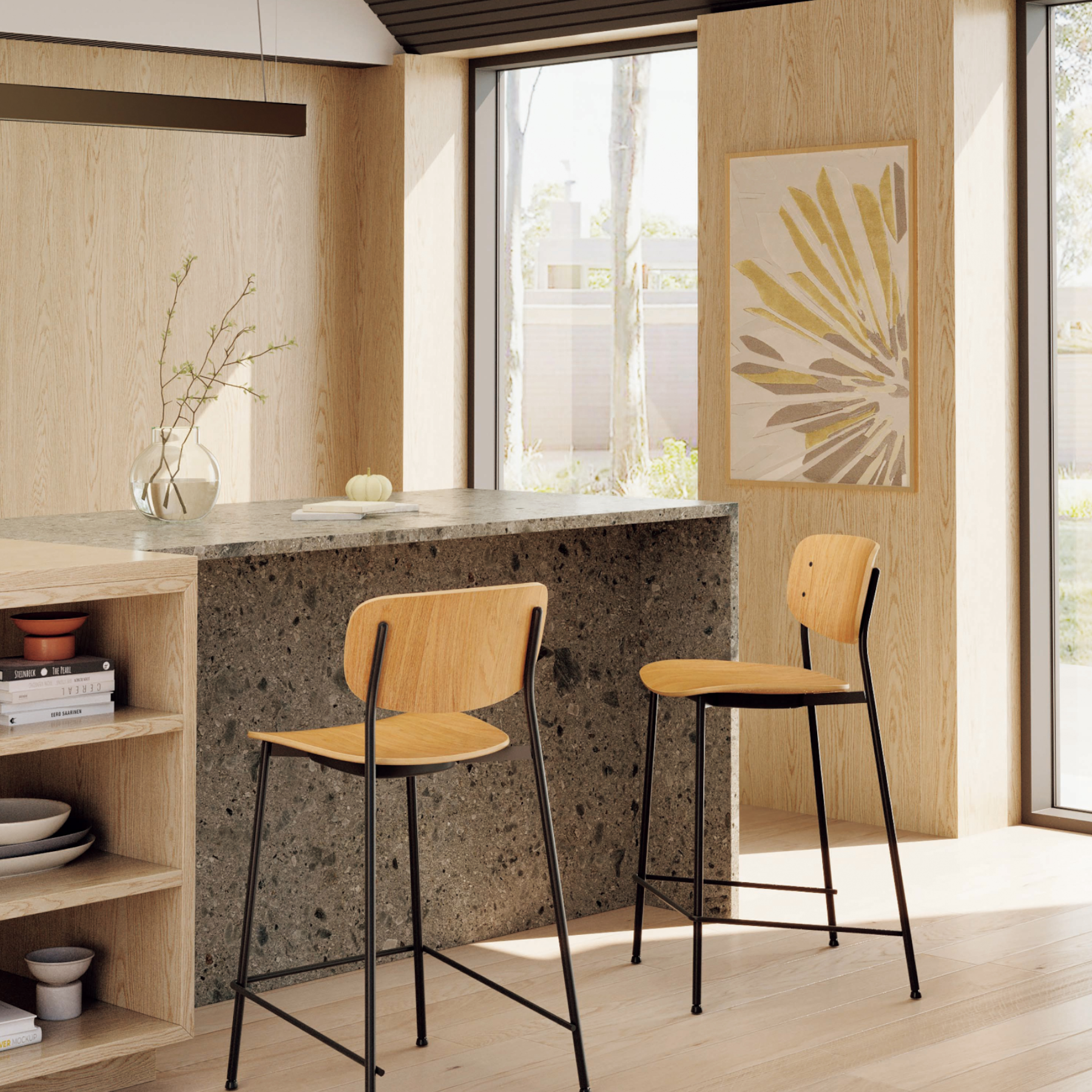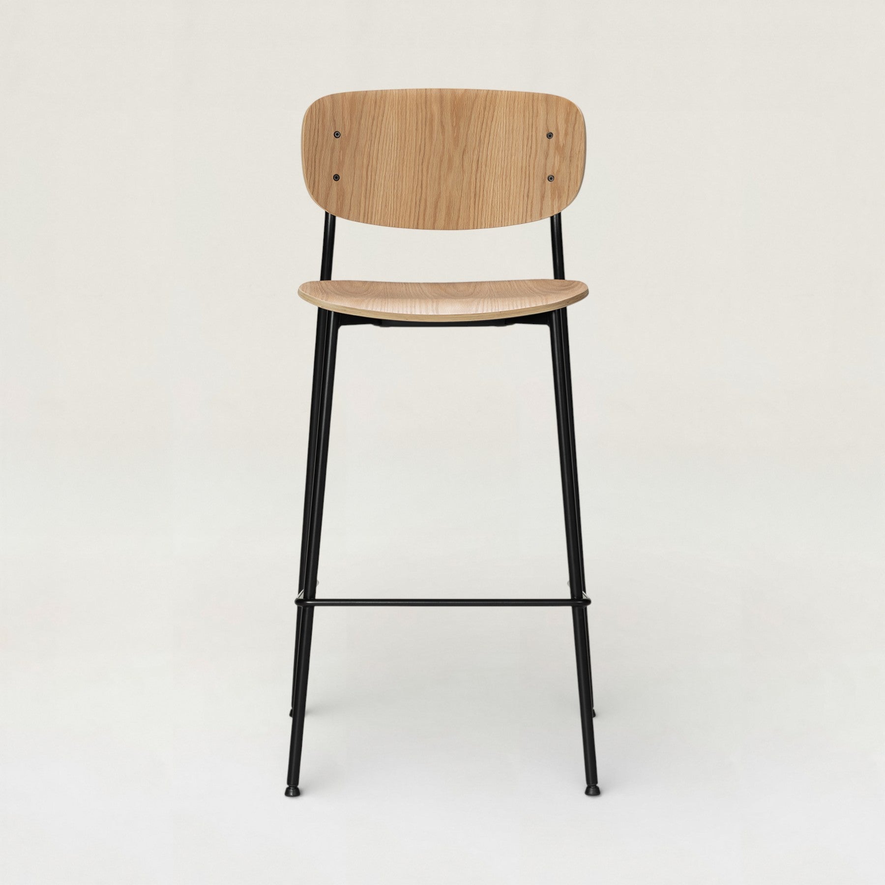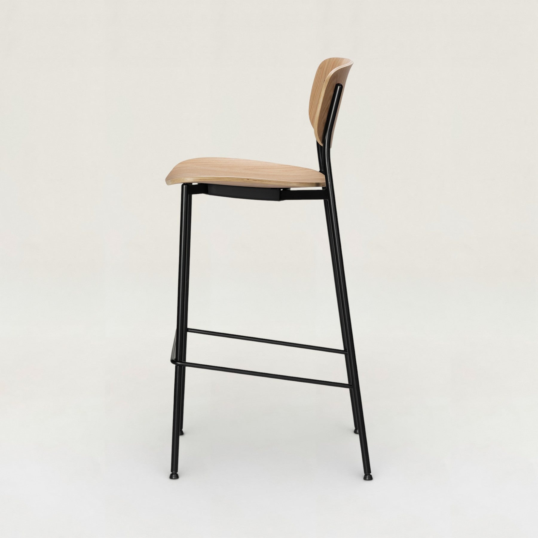 合板のやわらかな木目と、ブラックスチールの細身の脚が軽快に調和したカウンターチェア。