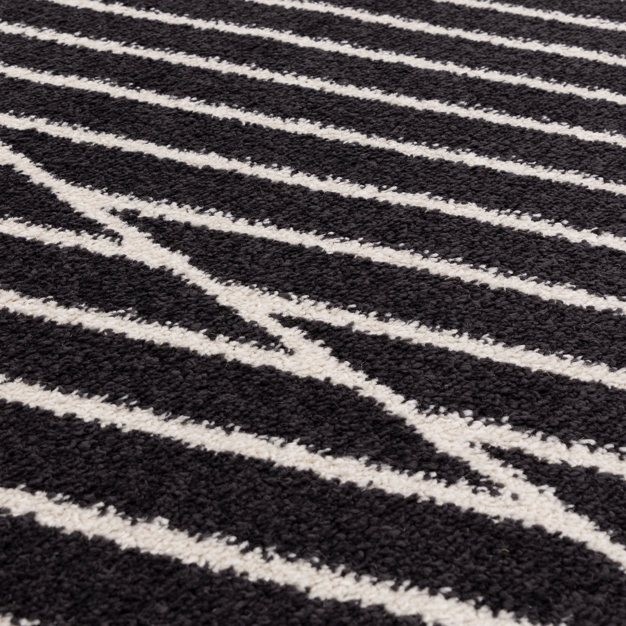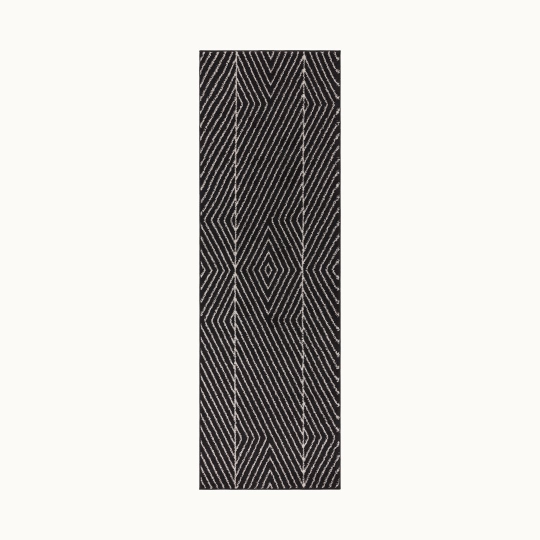 交錯した直線とモノクロのコントラストがスタイリッシュ。ブラックのランナーラグが空間全体をキリリと引き締めます。