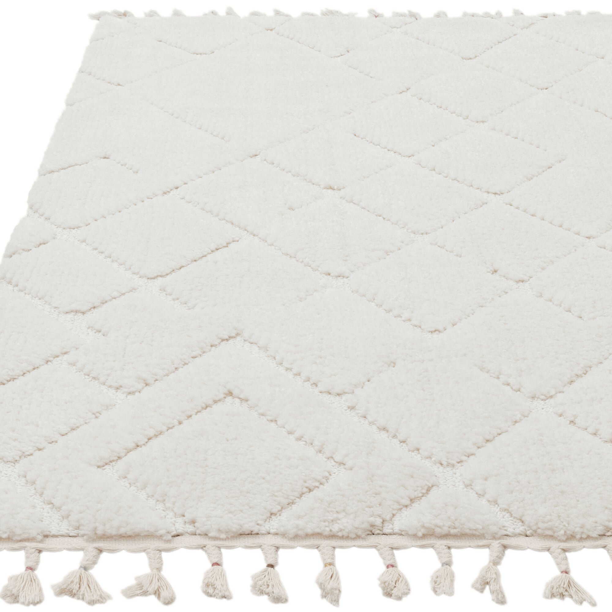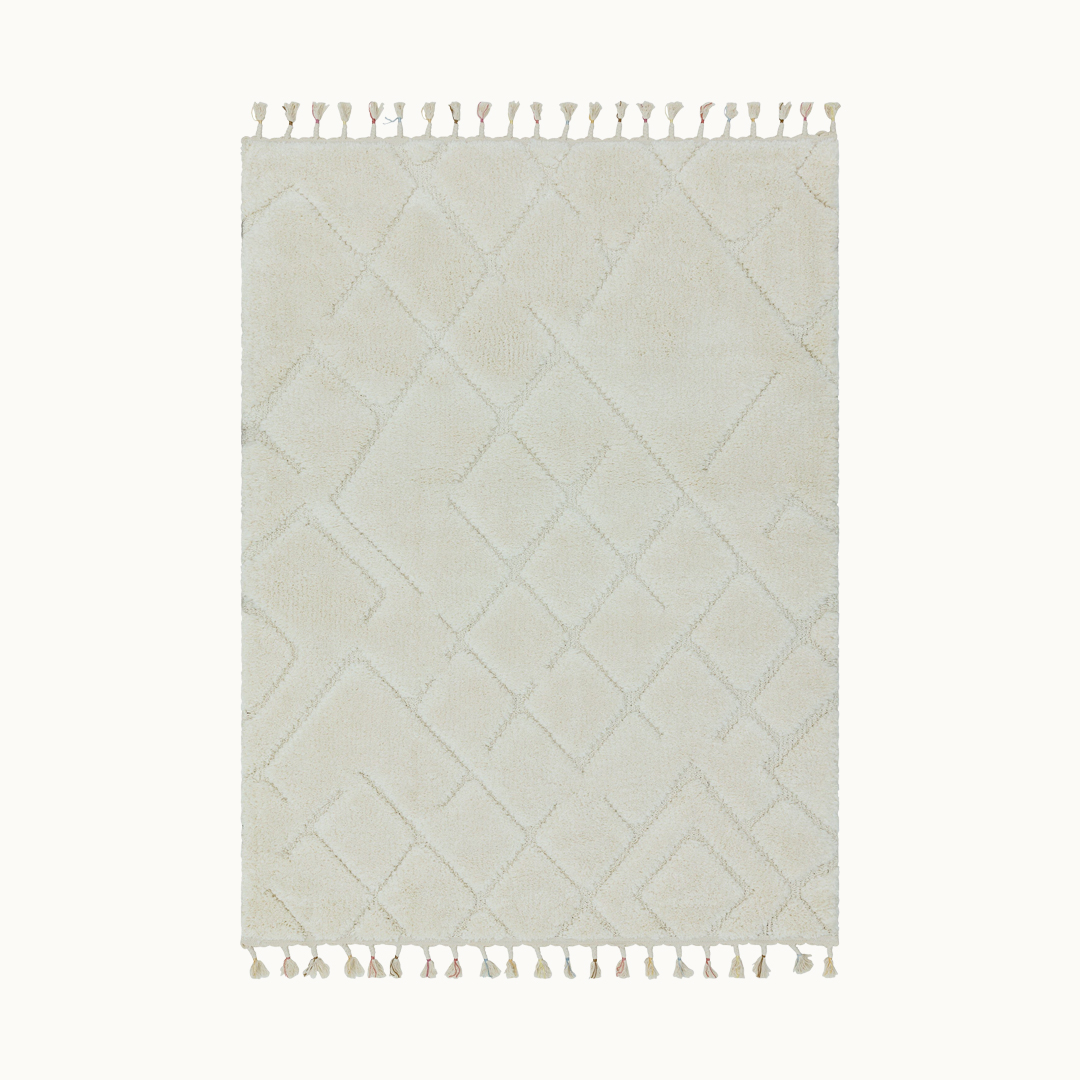 モダンなモロッカンスタイルのラグ。 ナチュラルなアイボリーで両端のタッセルフリンジがアクセント。