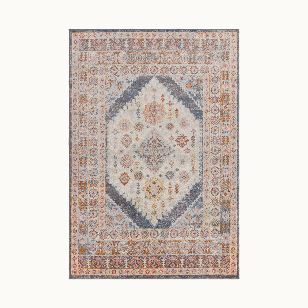 可憐な花々が散りばめられた暖色系のボーダーに、凛としたメダリオンが映えるオリエンタルラグ。気品が漂います。