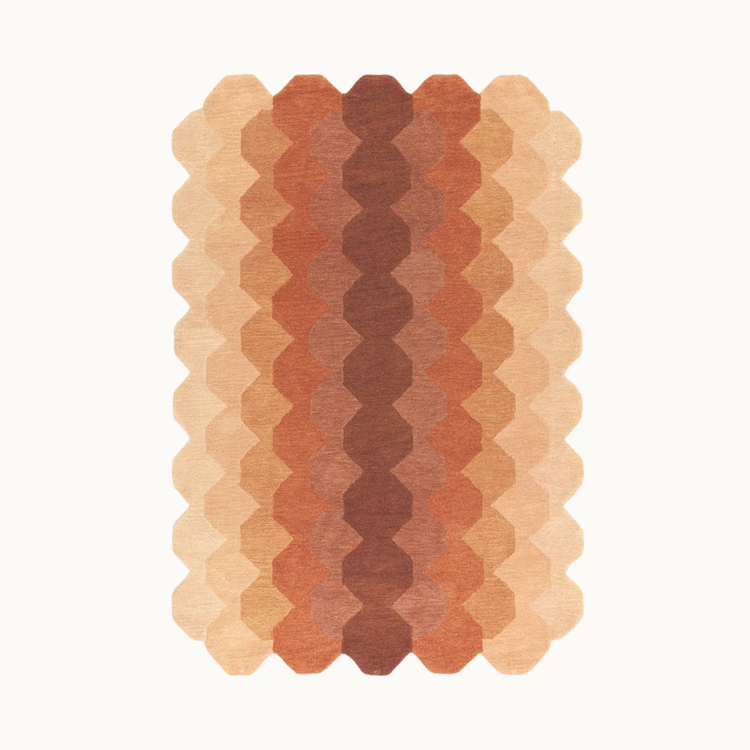ブリックカラーから、バーントオレンジ、アッシュローズ、エクルベージュへと変化するさまが美しい、ハンドタフトラグ。
