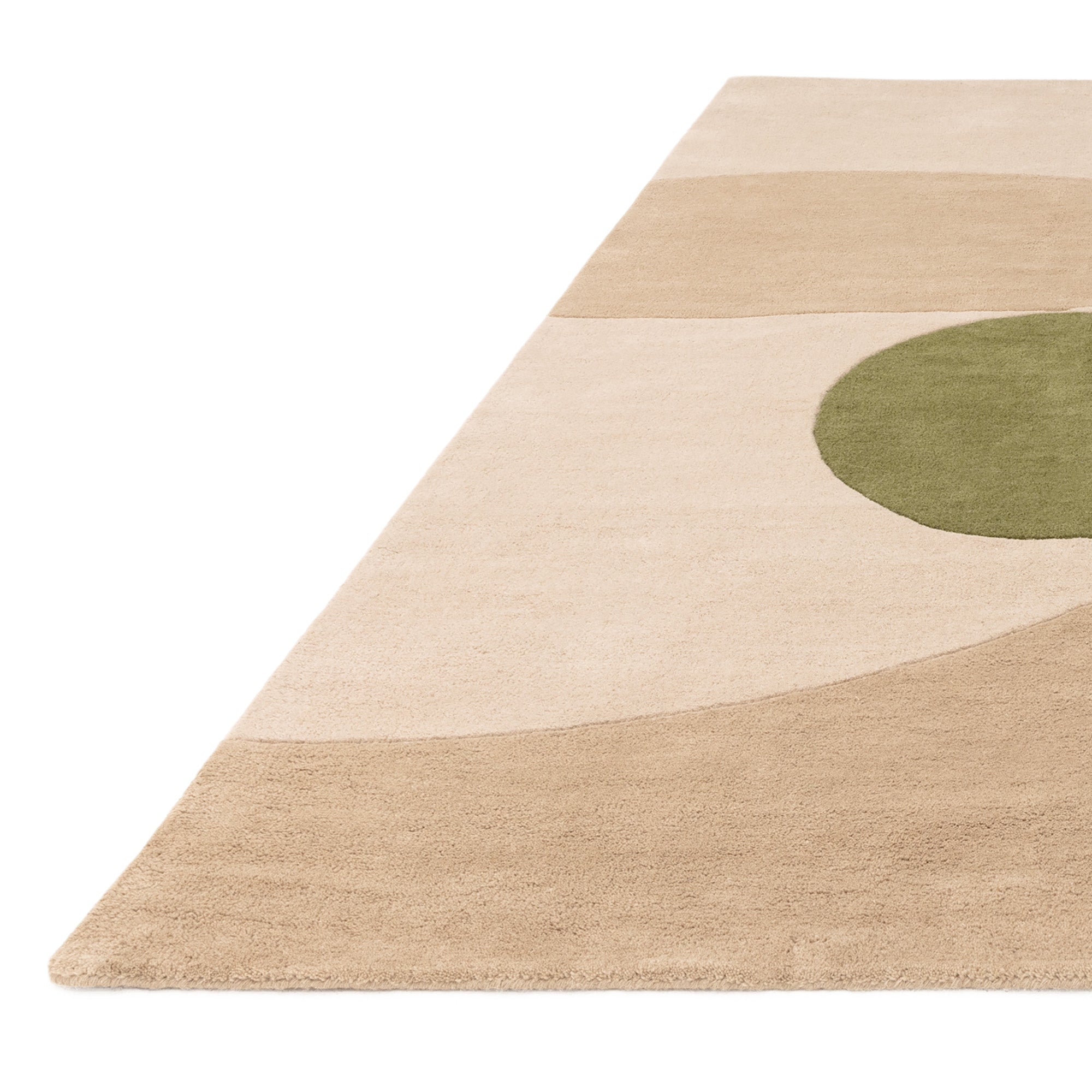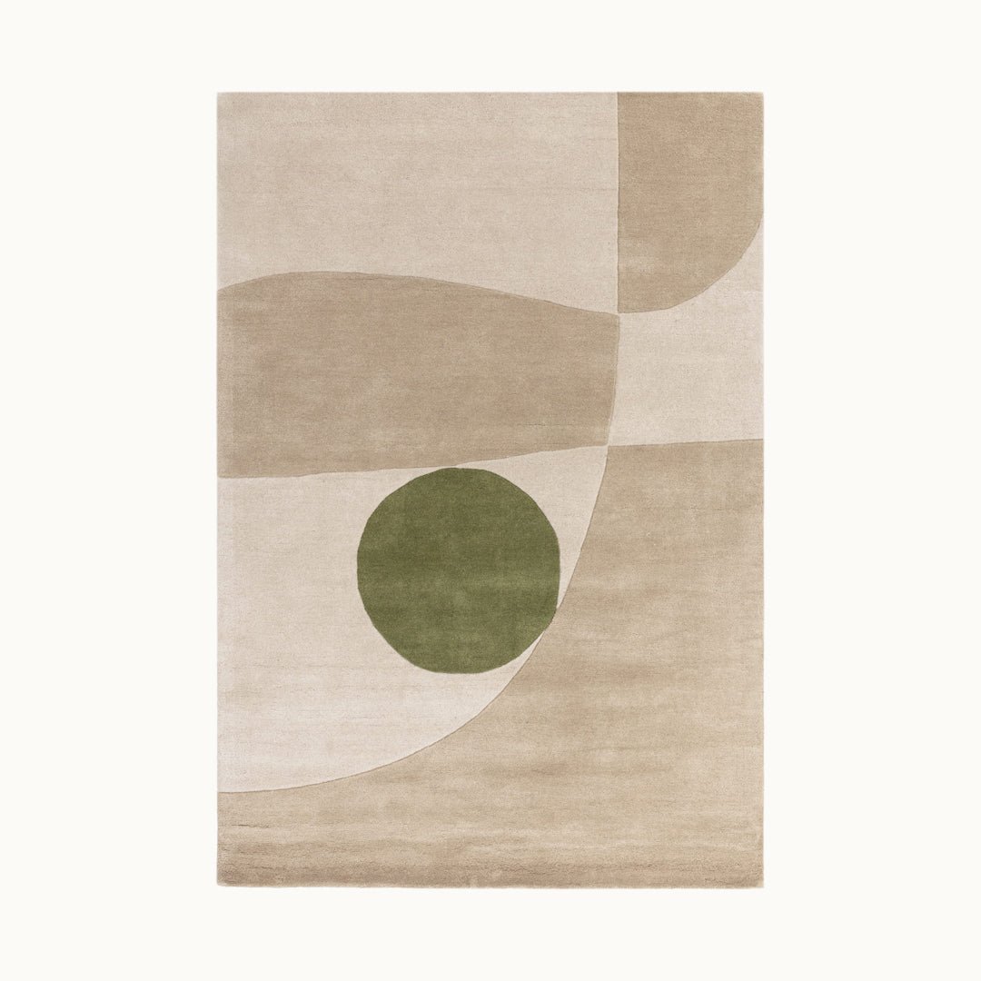 Ragnhild は自然の穏やかさを表現したような色使いのアートラグです。落ち着いたベージュトーンを基調とし、優しいグリーンのサークルがアクセントになります。