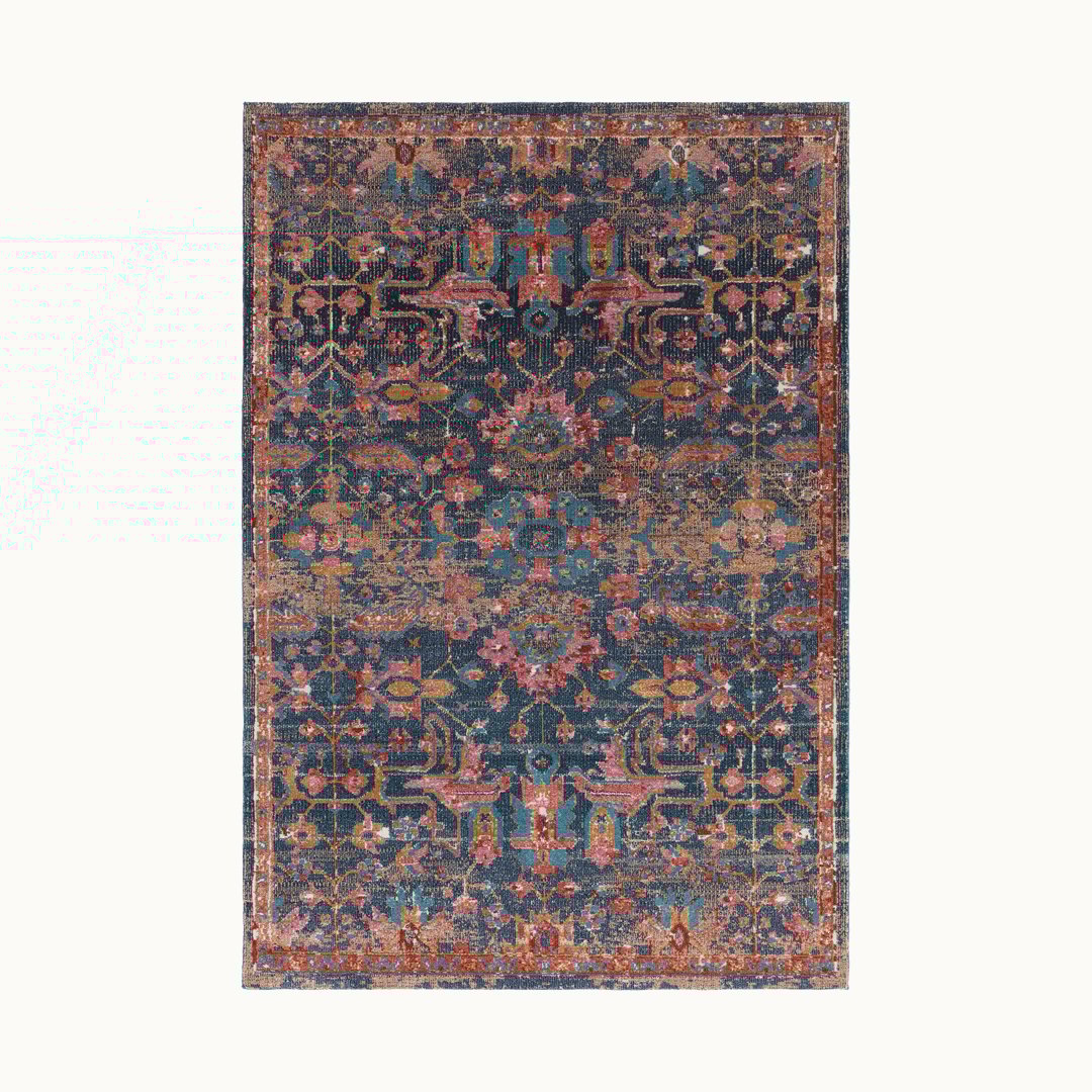 厳かなネイビーブルーにローズピンクとターコイズブルーが映えます。緻密なクラシックパターンが可憐なトライバルラグ。