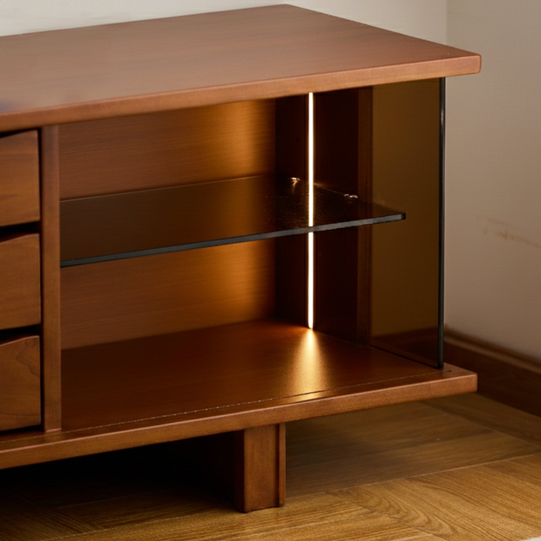 無垢材ならではのやさしい木目と、ガラス棚を備えたオープン収納がスタイリッシュなテレビボード。