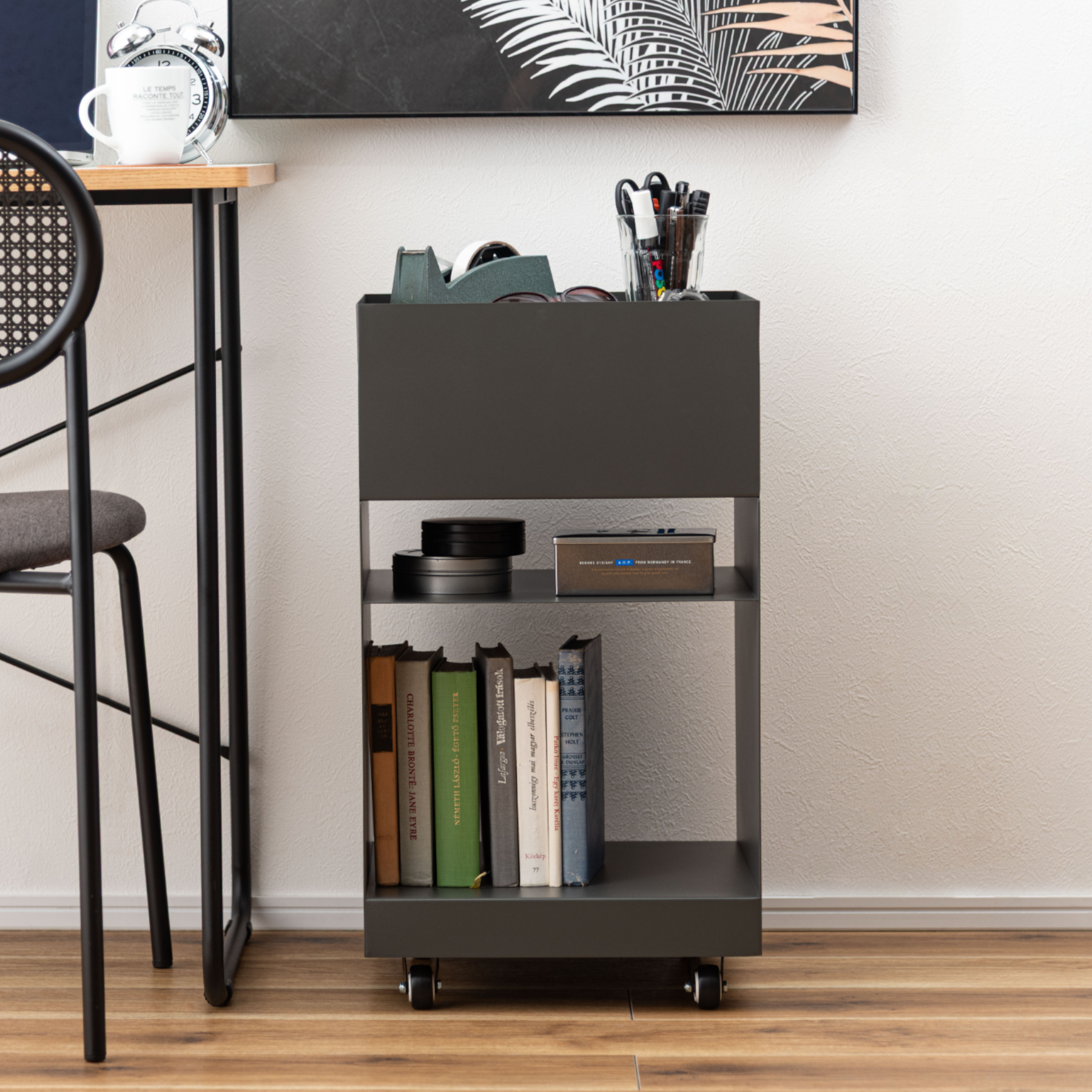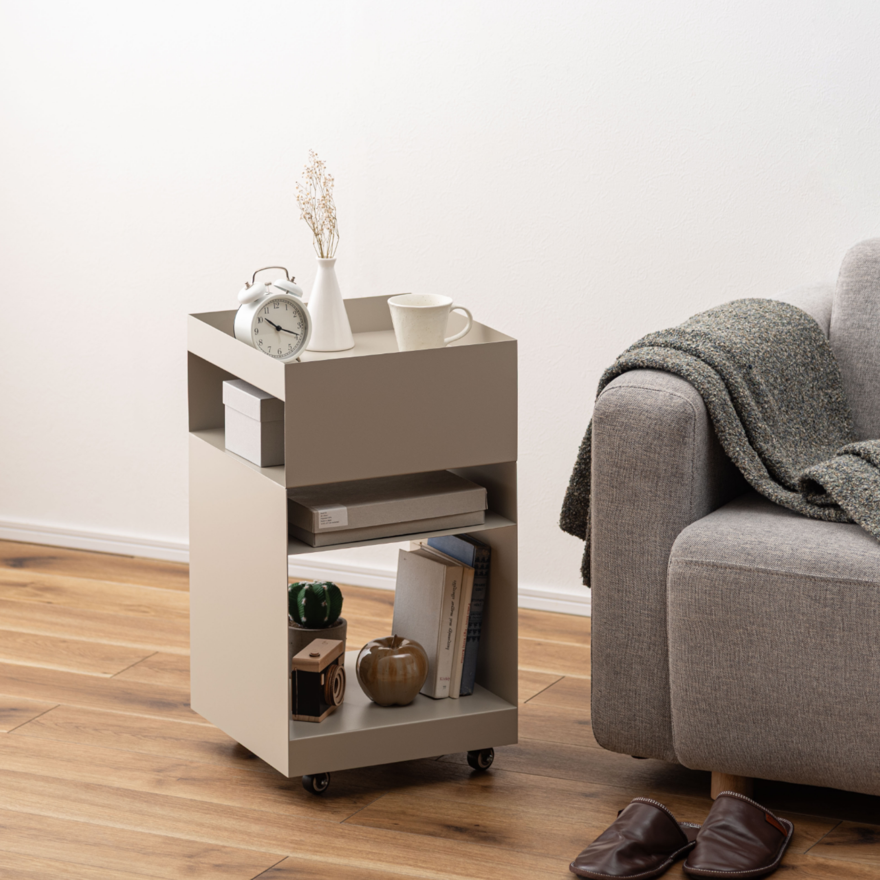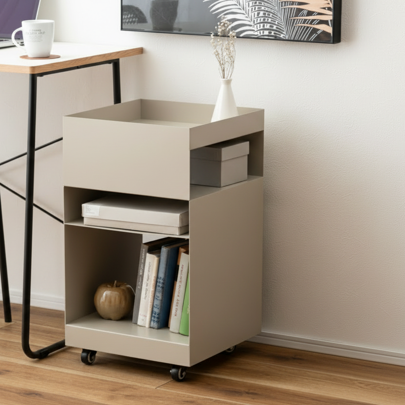キャスター付きで移動もスムーズ。リビングのサイドテーブルとしてはもちろん、デスクサイドやキッチンワゴンとしても活躍します。
