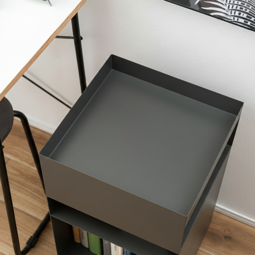 天板には囲いが付いているため、置いた物が落ちにくい安心設計。粉体塗装によるマット仕上げは、汚れてもさっと拭き取ることができ、清潔な状態を保てます。