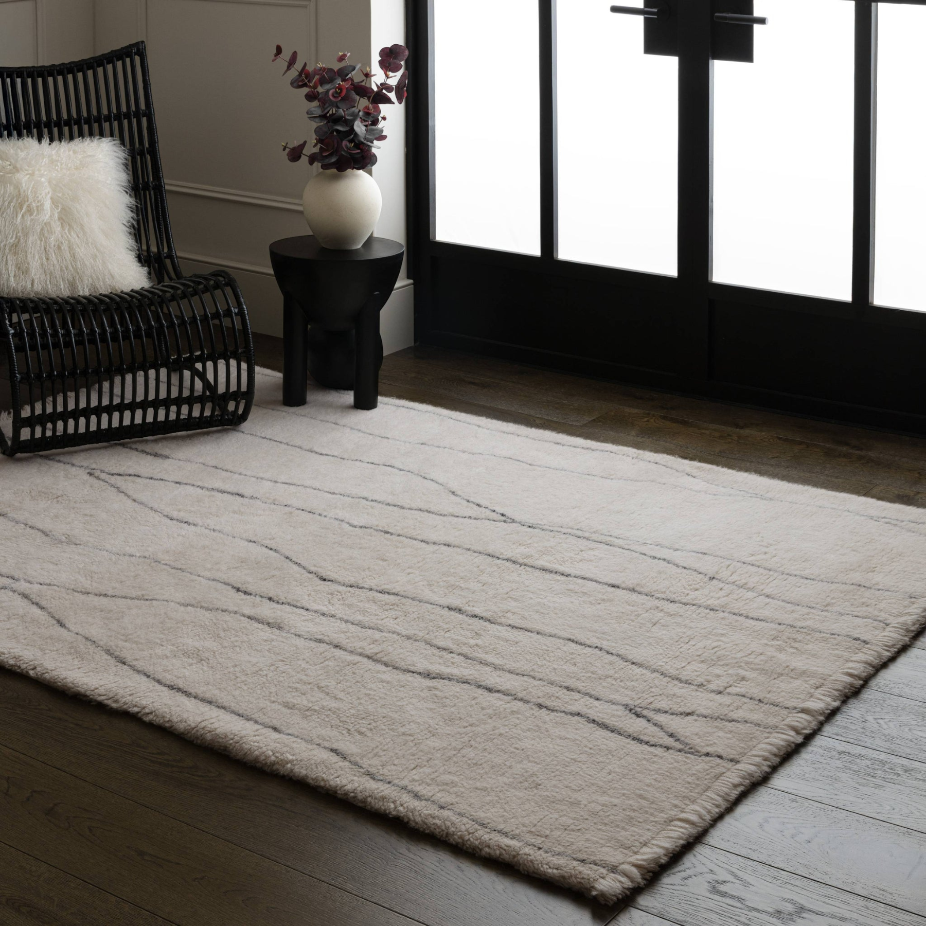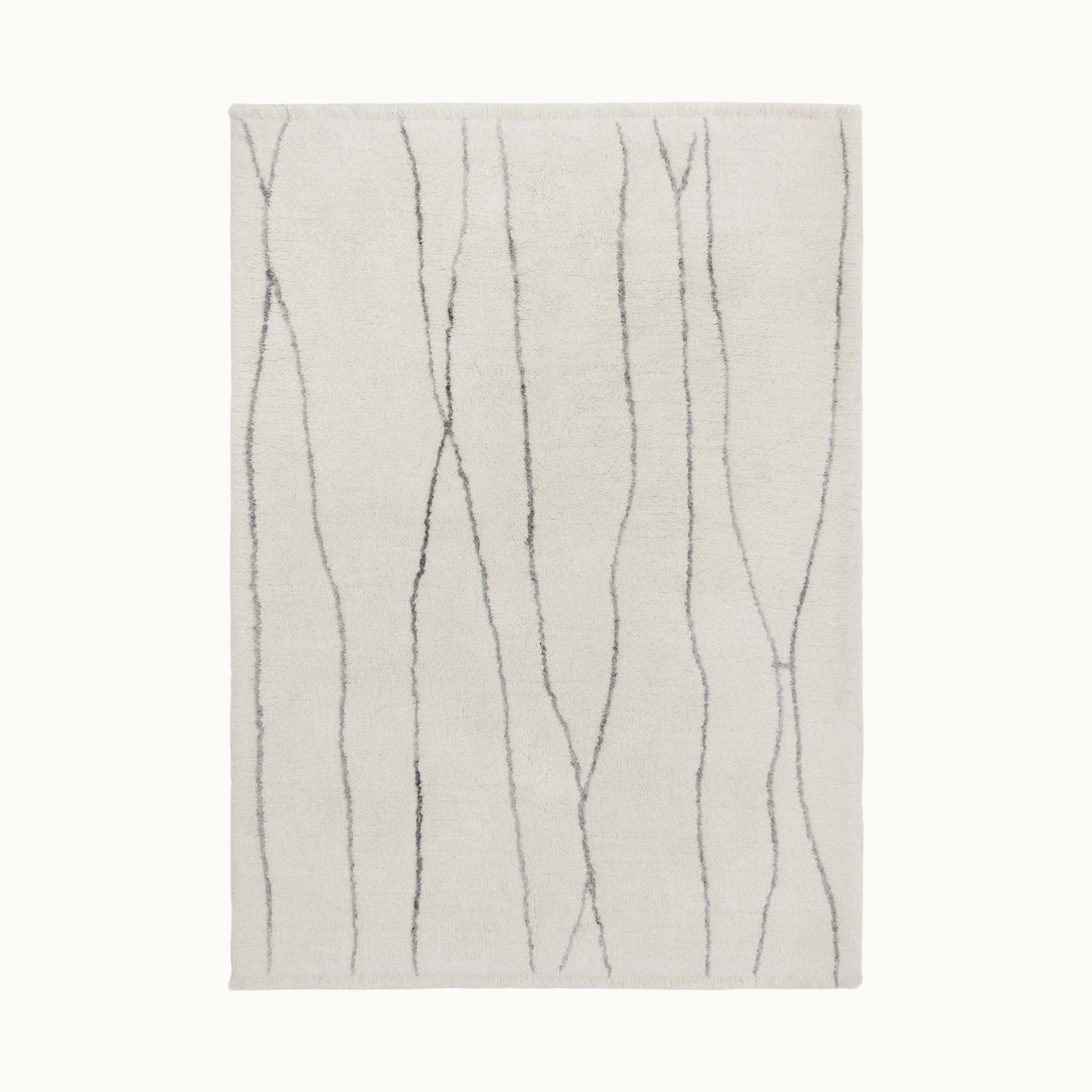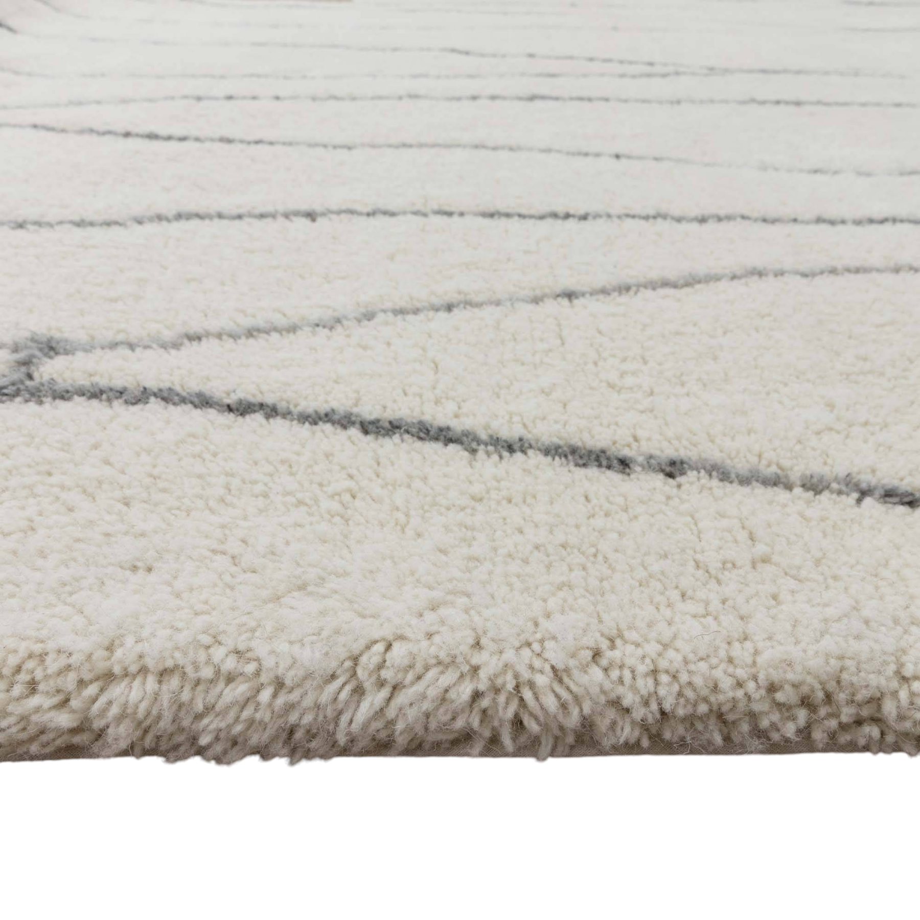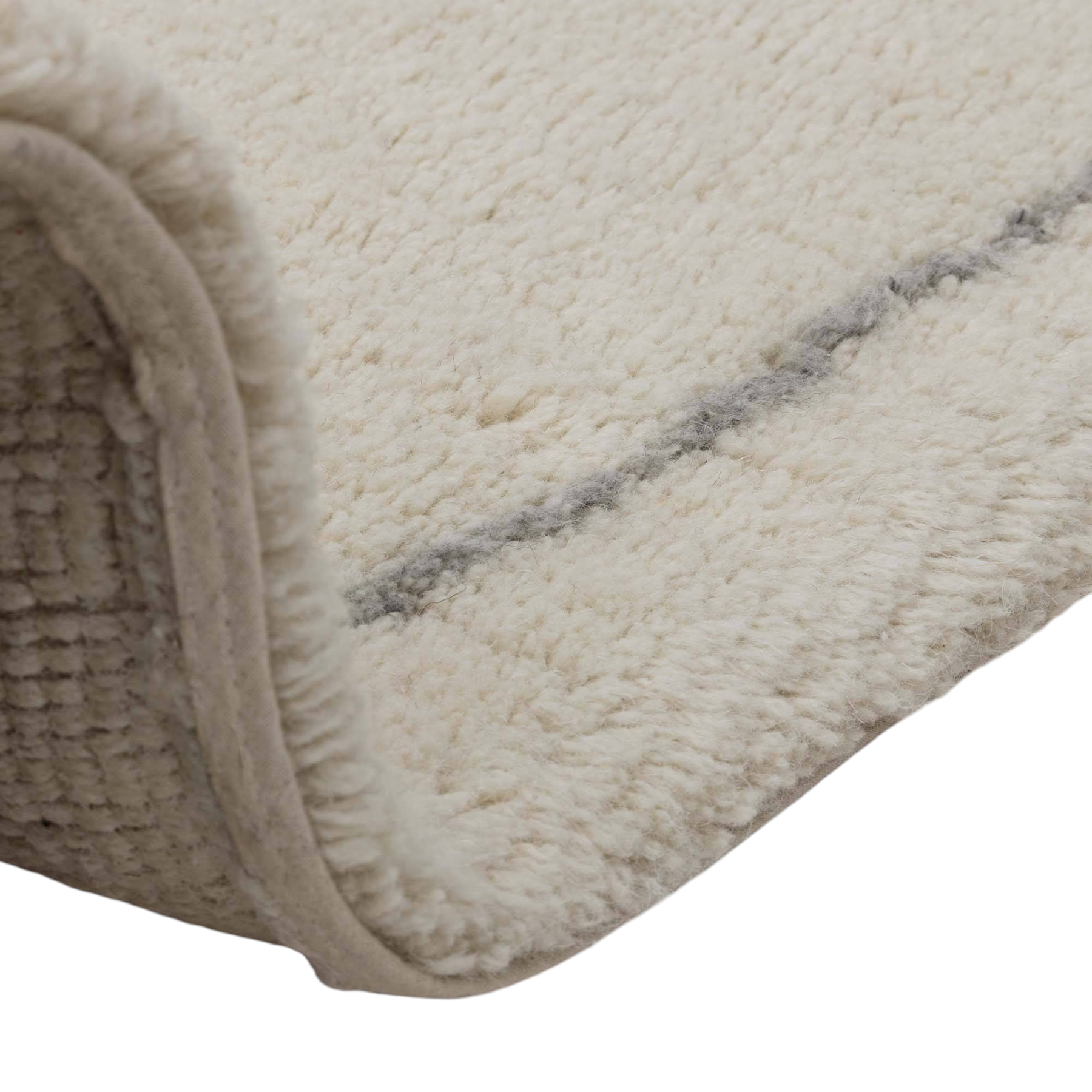 素材はウール100%。未染色ウールならではのナチュラルな色合いと、ふっくらとした毛足が特徴です。インドでハンドタフテッド製法により丁寧に仕立てられており、繊細な表情と上質な手触りをお楽しみいただけます。高い保温性と調湿性を兼ね備え、季節を問わず快適にお使いいただけます。