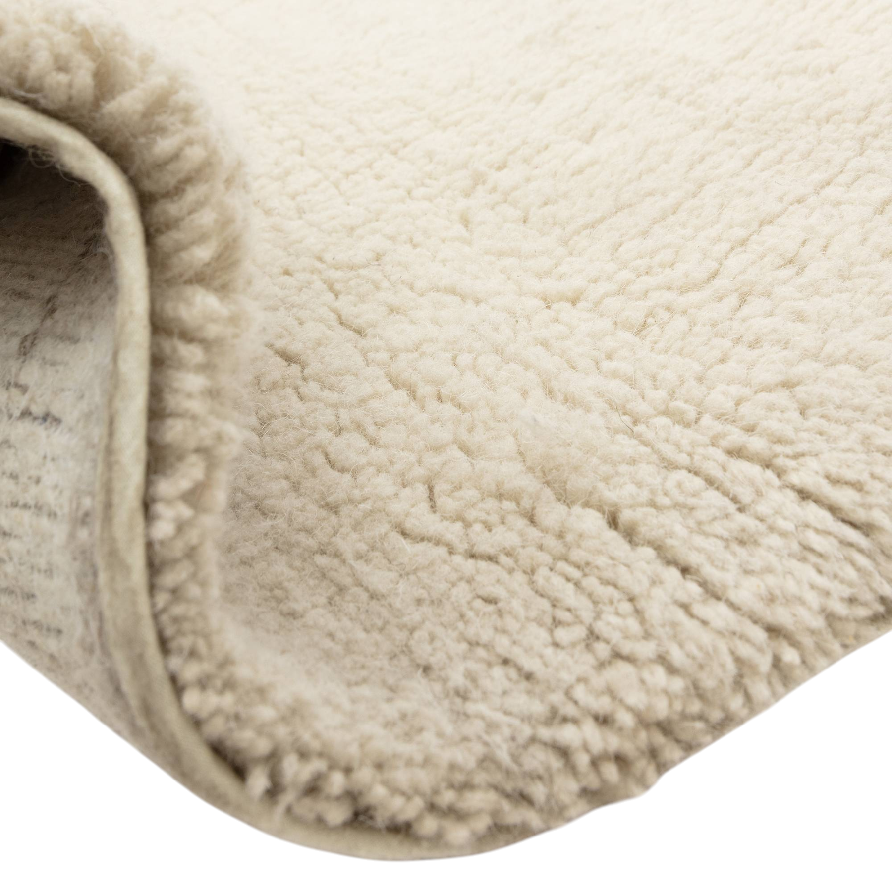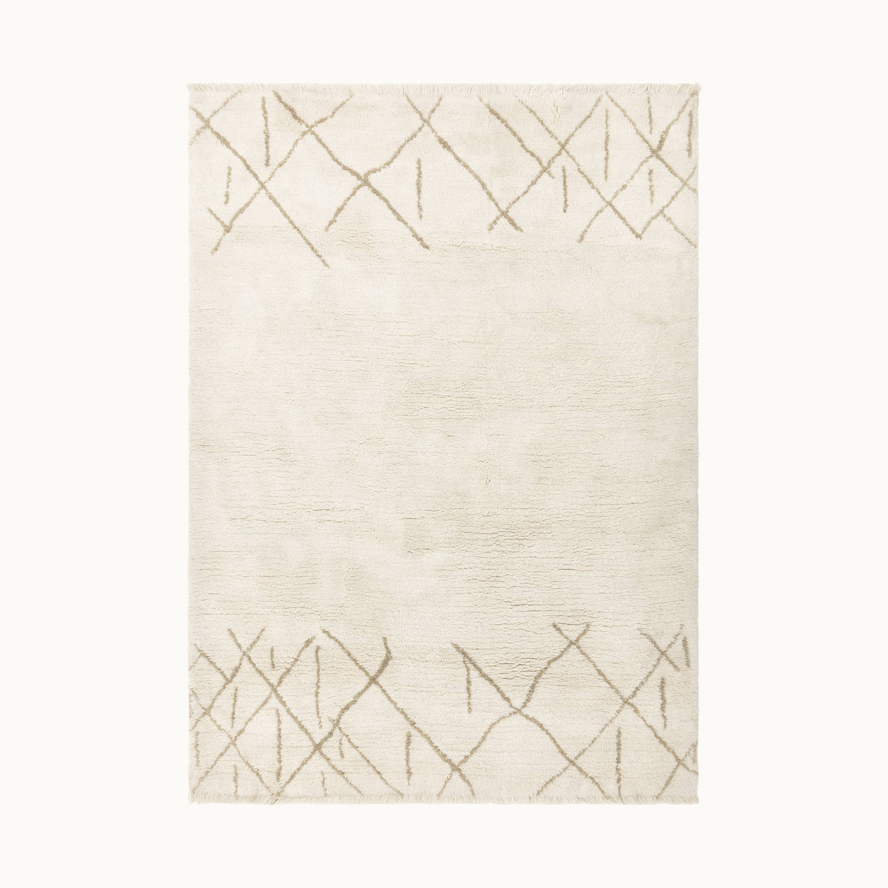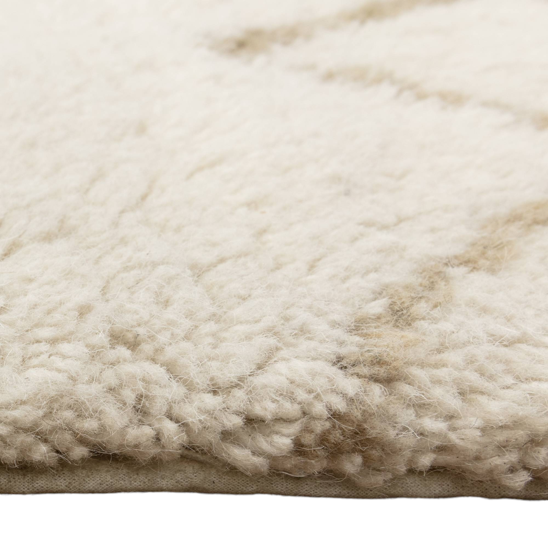 素材は上質なウール100%。インドでハンドタフテッド製法によって丁寧に織り上げられた一枚です。未染色ウールの自然な風合いと、厚みのあるパイルが生むふかふかの踏み心地が魅力。ウール特有の防汚性や調湿性により、日常使いにも適した実用性を備えています。