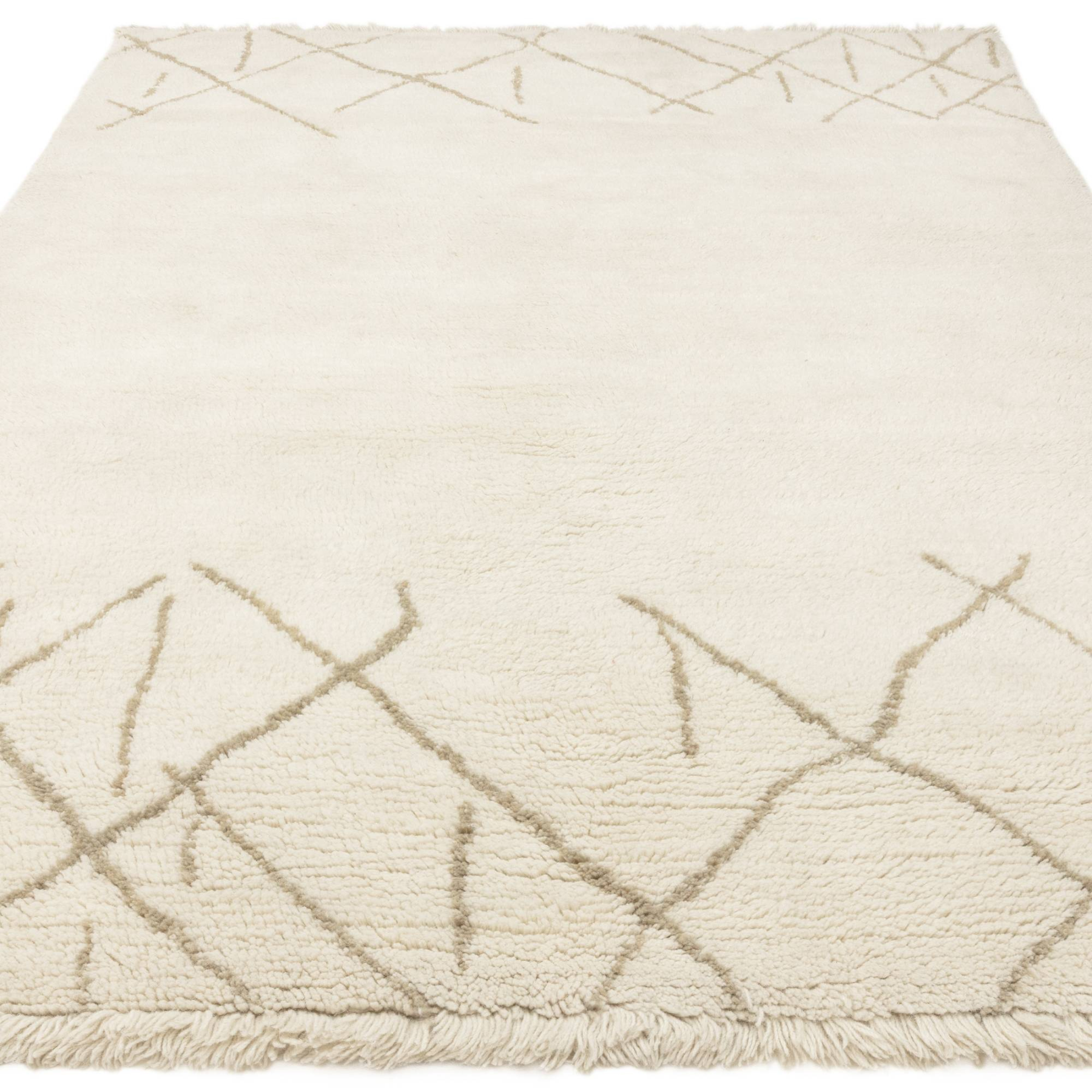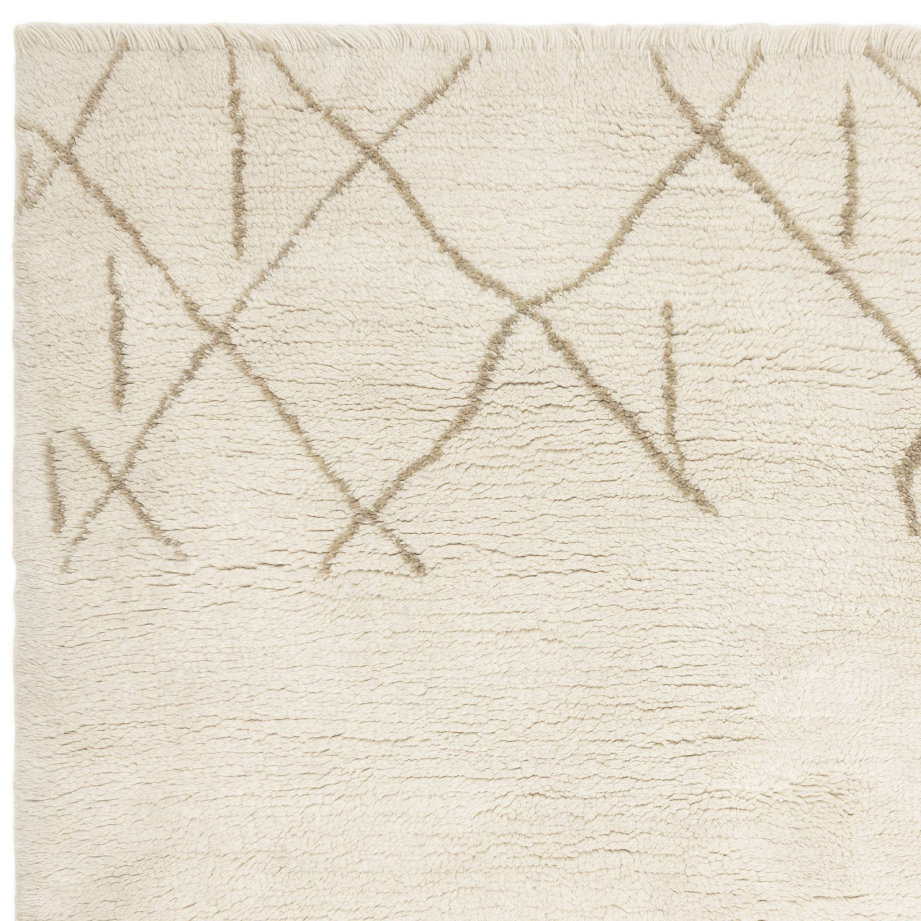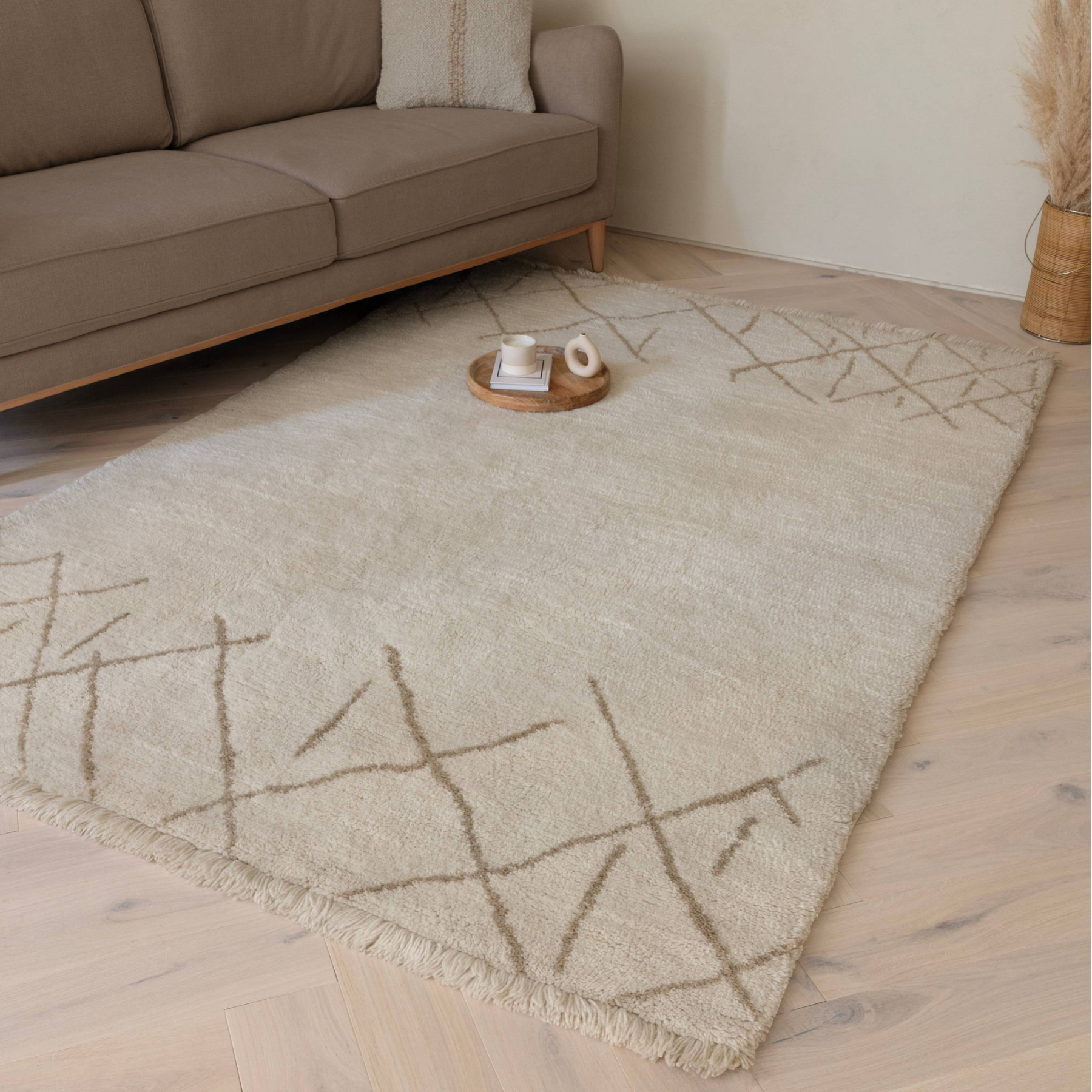 素材は上質なウール100%。インドでハンドタフテッド製法によって丁寧に織り上げられた一枚です。未染色ウールの自然な風合いと、厚みのあるパイルが生むふかふかの踏み心地が魅力。ウール特有の防汚性や調湿性により、日常使いにも適した実用性を備えています。