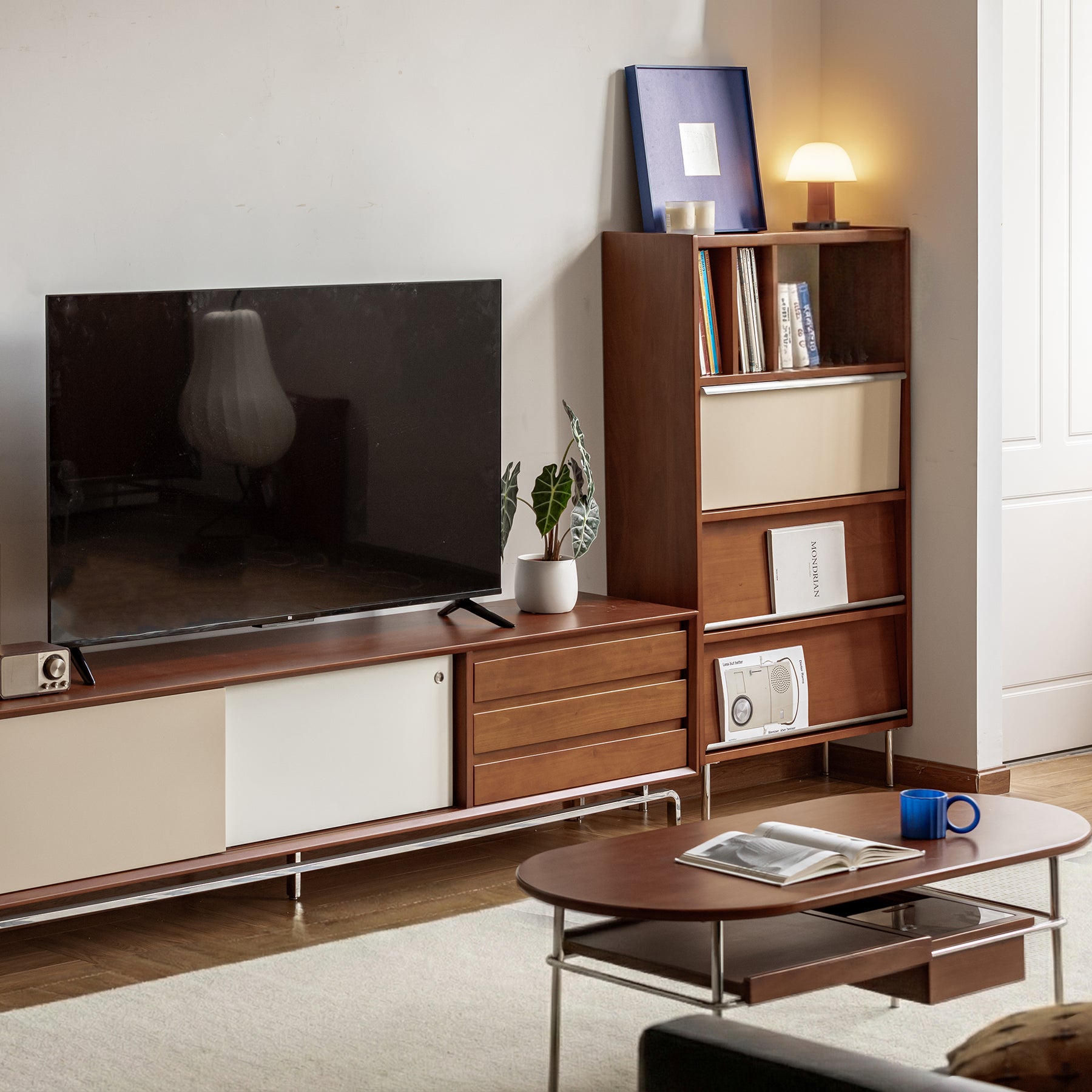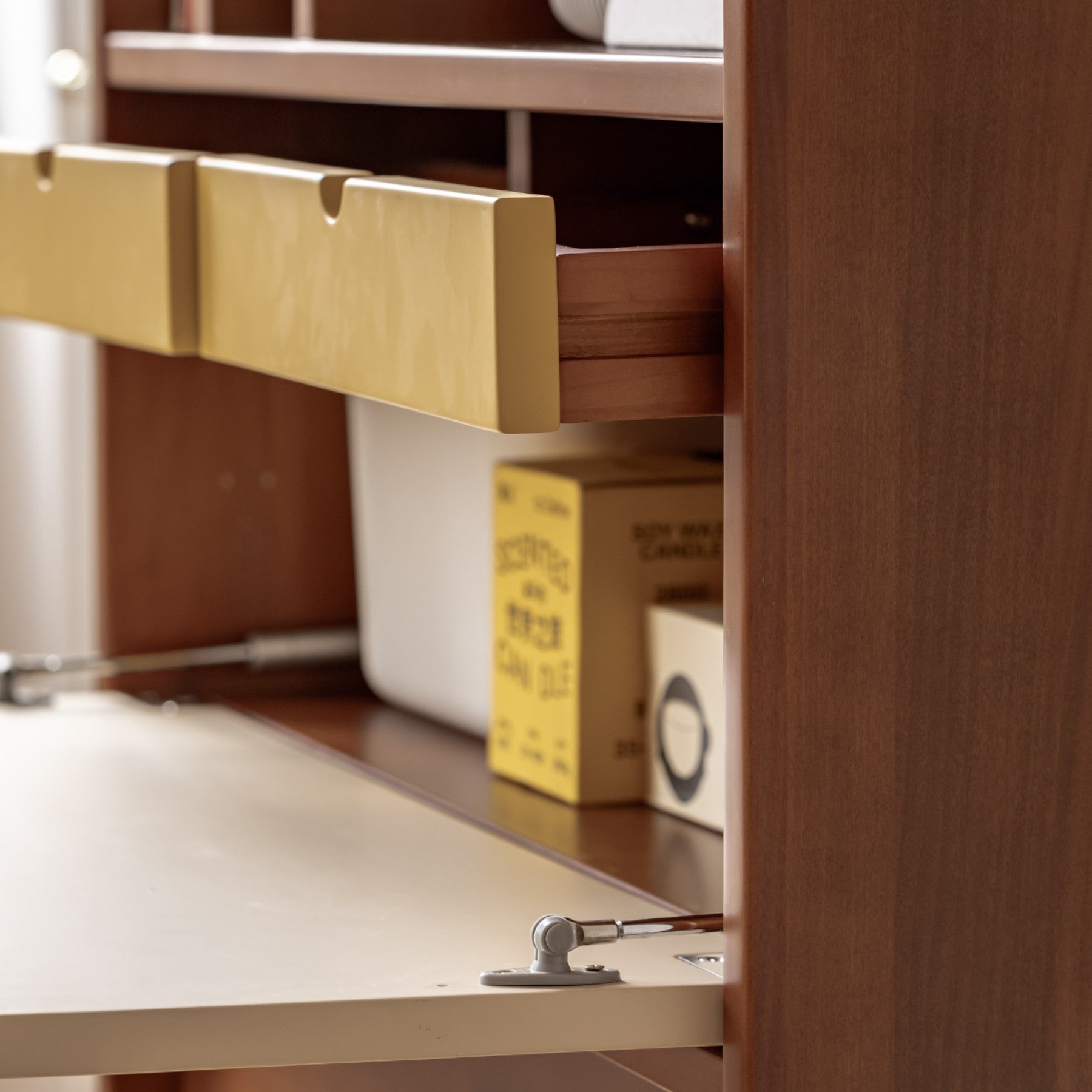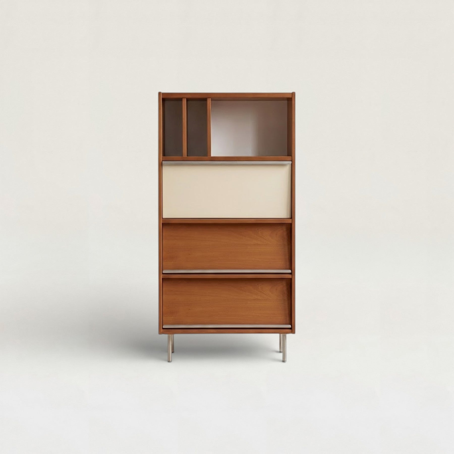 オープン部分と扉収納を組み合わせた構成が、見せる楽しさと整える心地よさを両立し、暮らしの中に自然なリズムを生み出します。壁面に置いても重たく見えにくく、リビングやワークスペースにも取り入れやすい佇まいです。