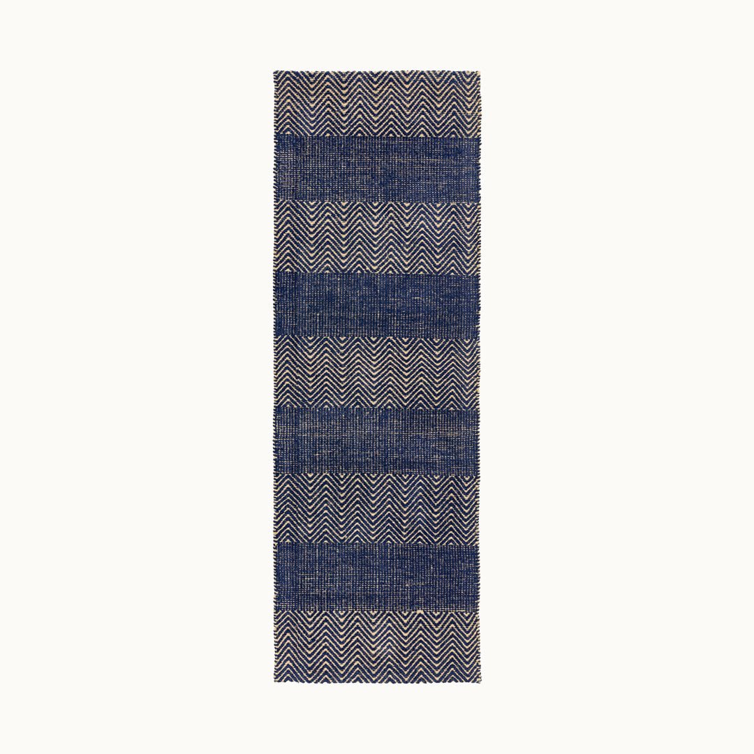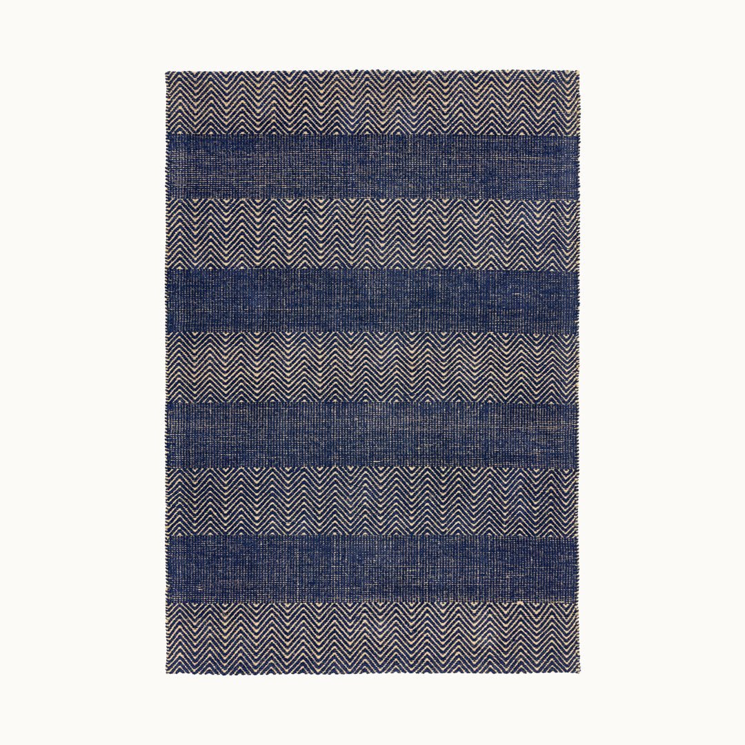 Maeve はジグザグパターンをベースにストライプが織り込まれた手織りのアートラグ。 深みのあるネイビーの色合いと模様が、視覚的にインパクトを与えます。