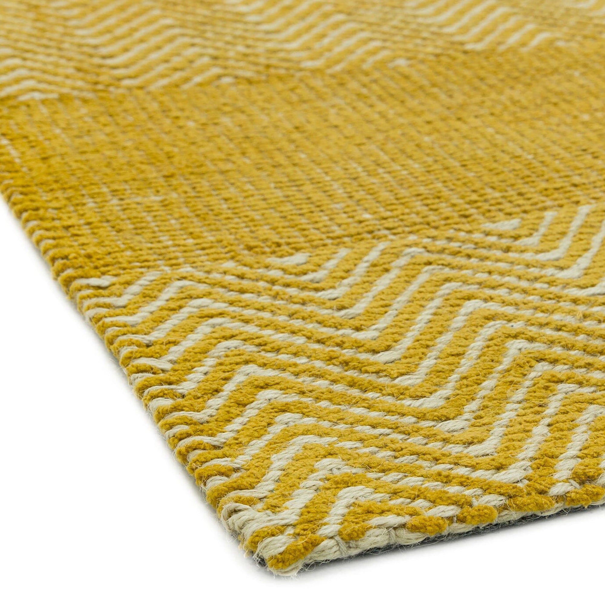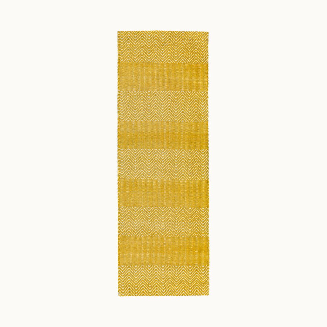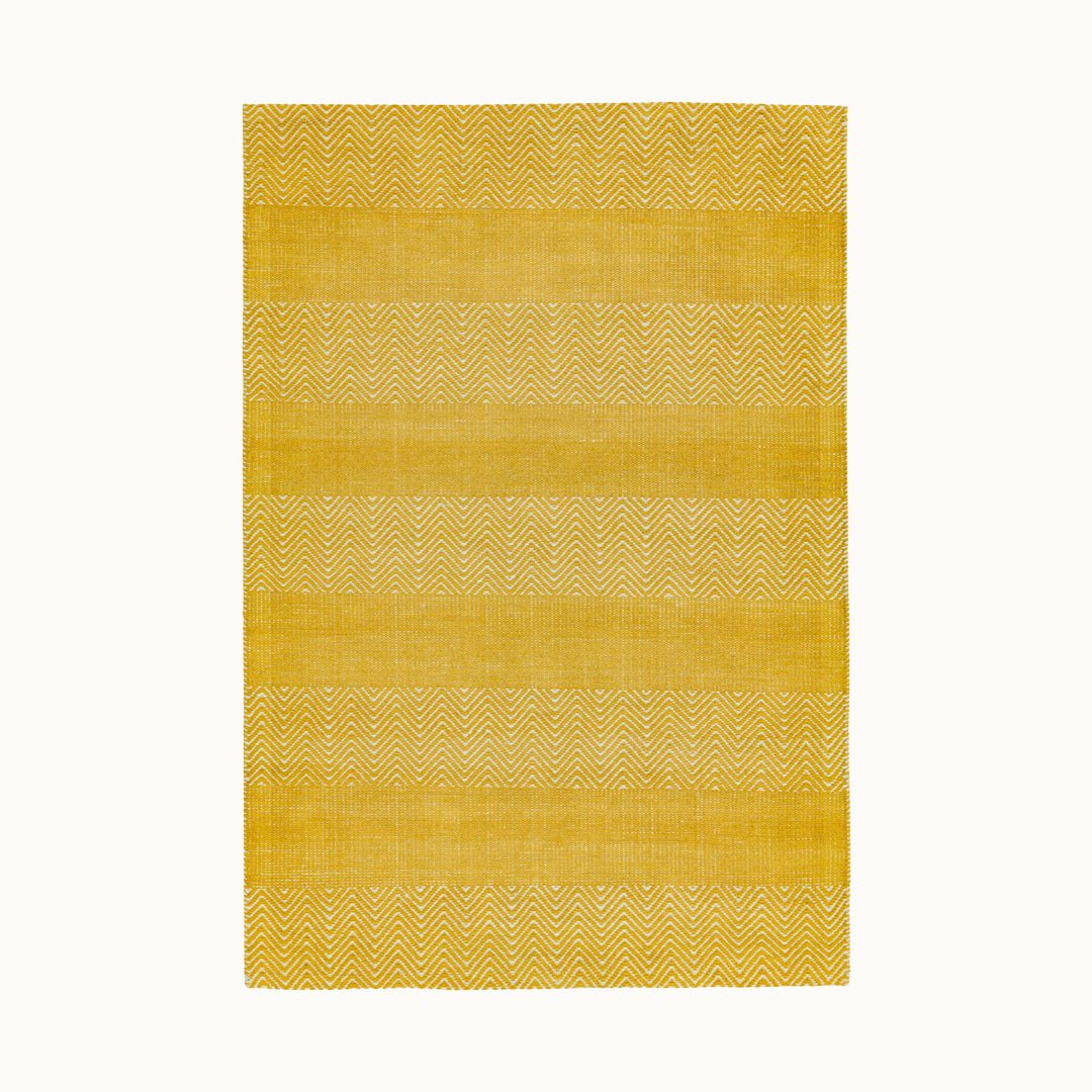 Odin はジグザグパターンをベースにストライプが織り込まれた手織りのアートラグ。ビビッドなイエローは、視覚的にインパクトがあり、一枚敷くだけで元気をもらえそう。