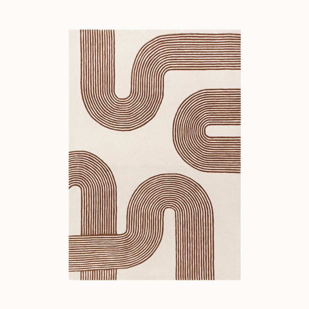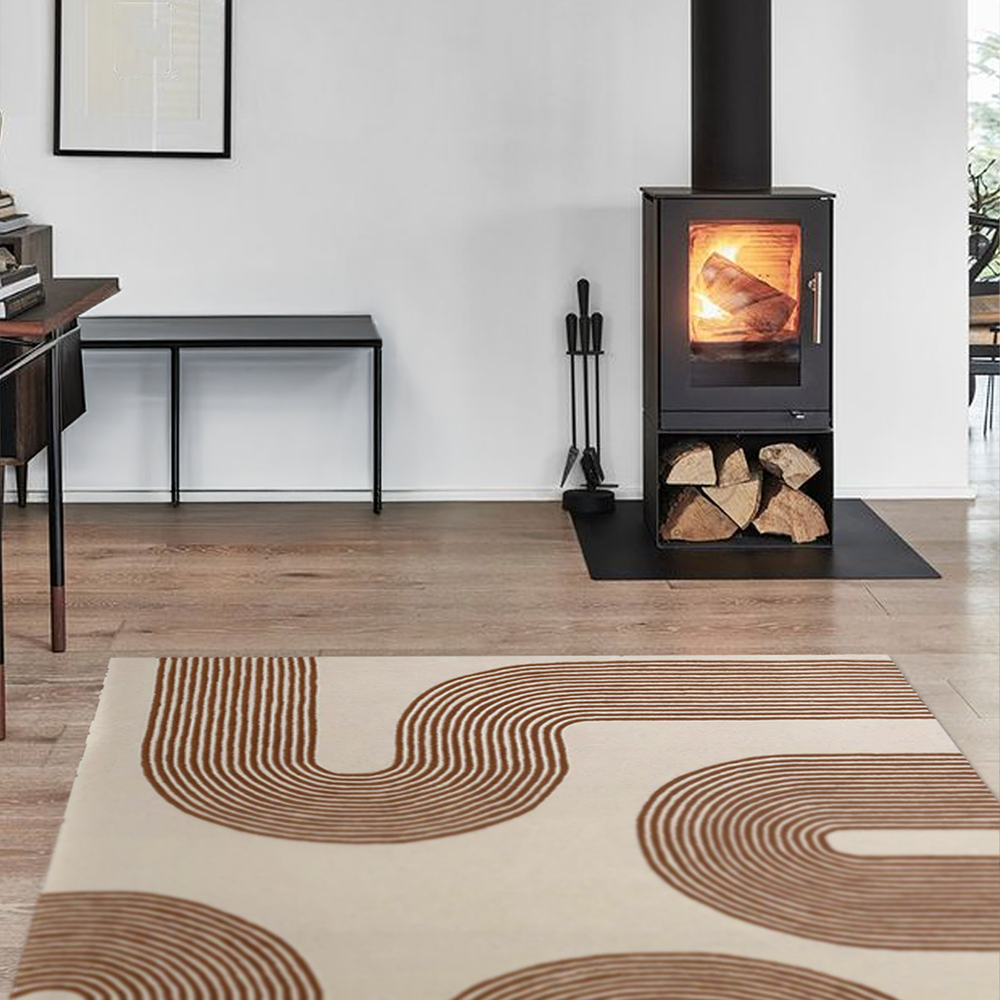オレンジのラインアートが、ラグの端から端まで広がるデザインが魅力的。お部屋に動きがあるかのような錯覚を引き起こし、動的なエネルギーをもたらします。
