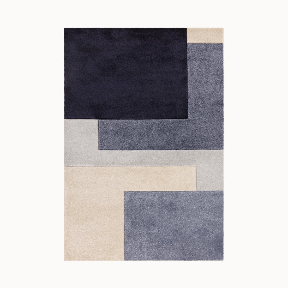 160x230cmサイズのシンプルな幾何学パターン × くすんだ寒色系の配色(ブラックに近いミッドナイトブルー、スモークブルー、インディゴブルー、ベビーブルー、アイボリー)がスタイリッシュで知的な、お手入れ楽ちんポリプロピレン製RUGHAUSのモダンアートデザインラグ