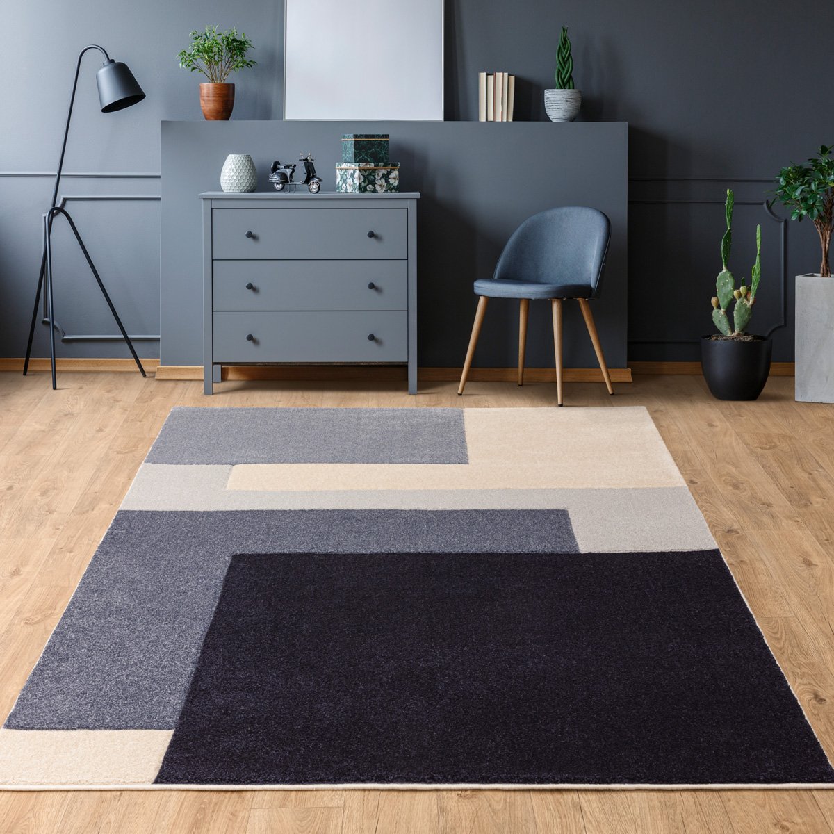 200x290cmサイズのシンプルな幾何学パターン × くすんだ寒色系の配色(ブラックに近いミッドナイトブルー、スモークブルー、インディゴブルー、ベビーブルー、アイボリー)がスタイリッシュで知的な、お手入れ楽ちんポリプロピレン製RUGHAUSのモダンアートデザインラグ
