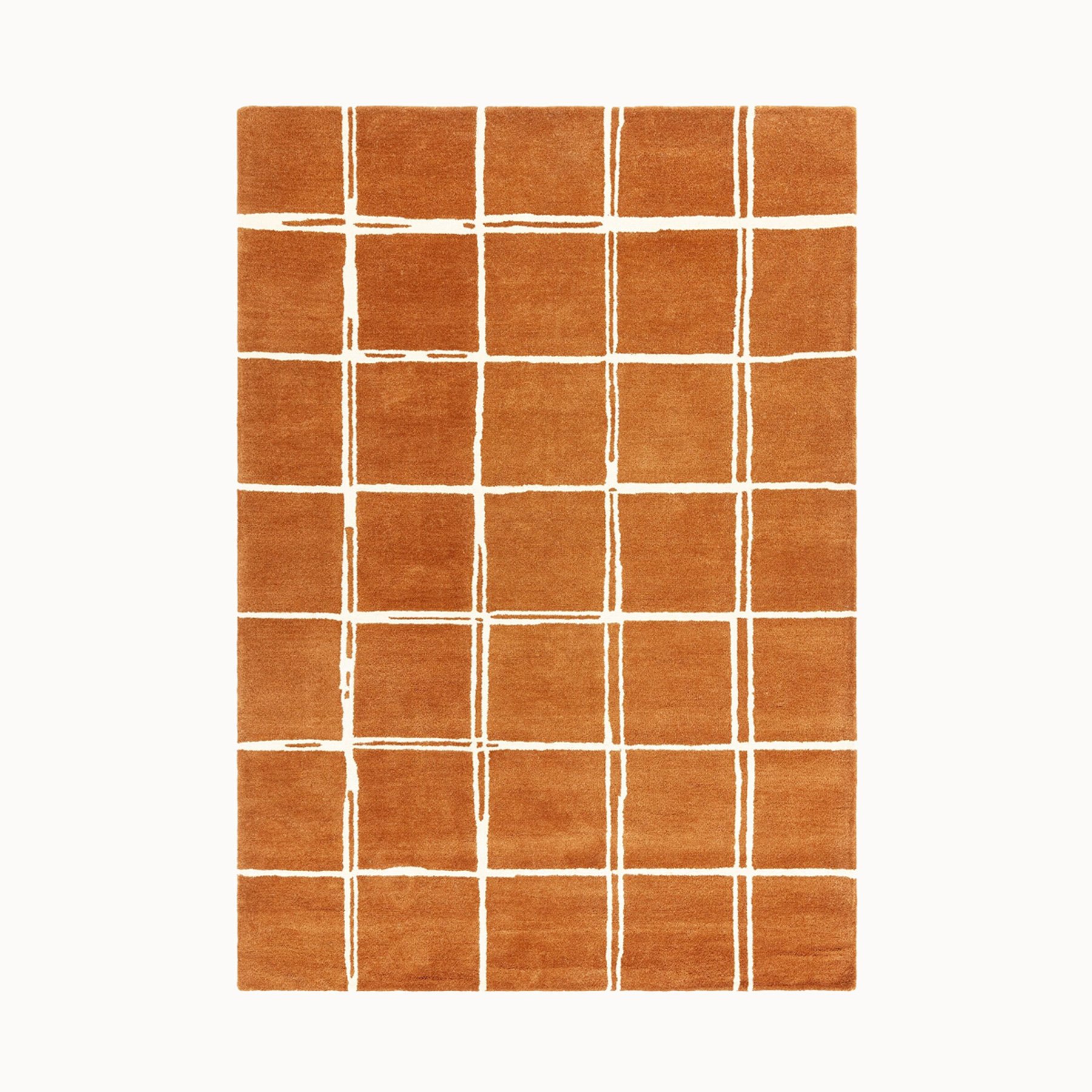200x290cm大きめサイズの、ブリックオレンジ×クリーム色のラフに描かれた格子パターンが可愛らしい、シンプルながらもセンスがきらりと光る、天然素材ウール100%製RUGHAUSのハンドタフトラグ Ane