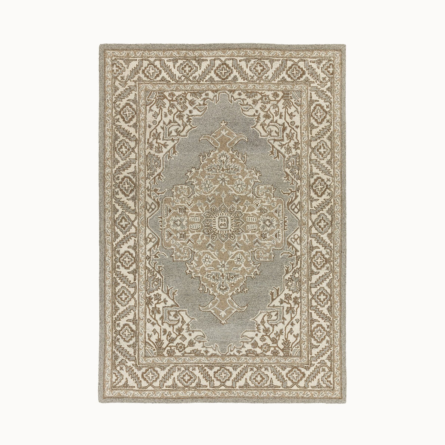 伝統的なペルシャ絨毯のデザインをモチーフに、ニュートラルモダンな色調で仕上げた、ウールのハンドタフトラグ。