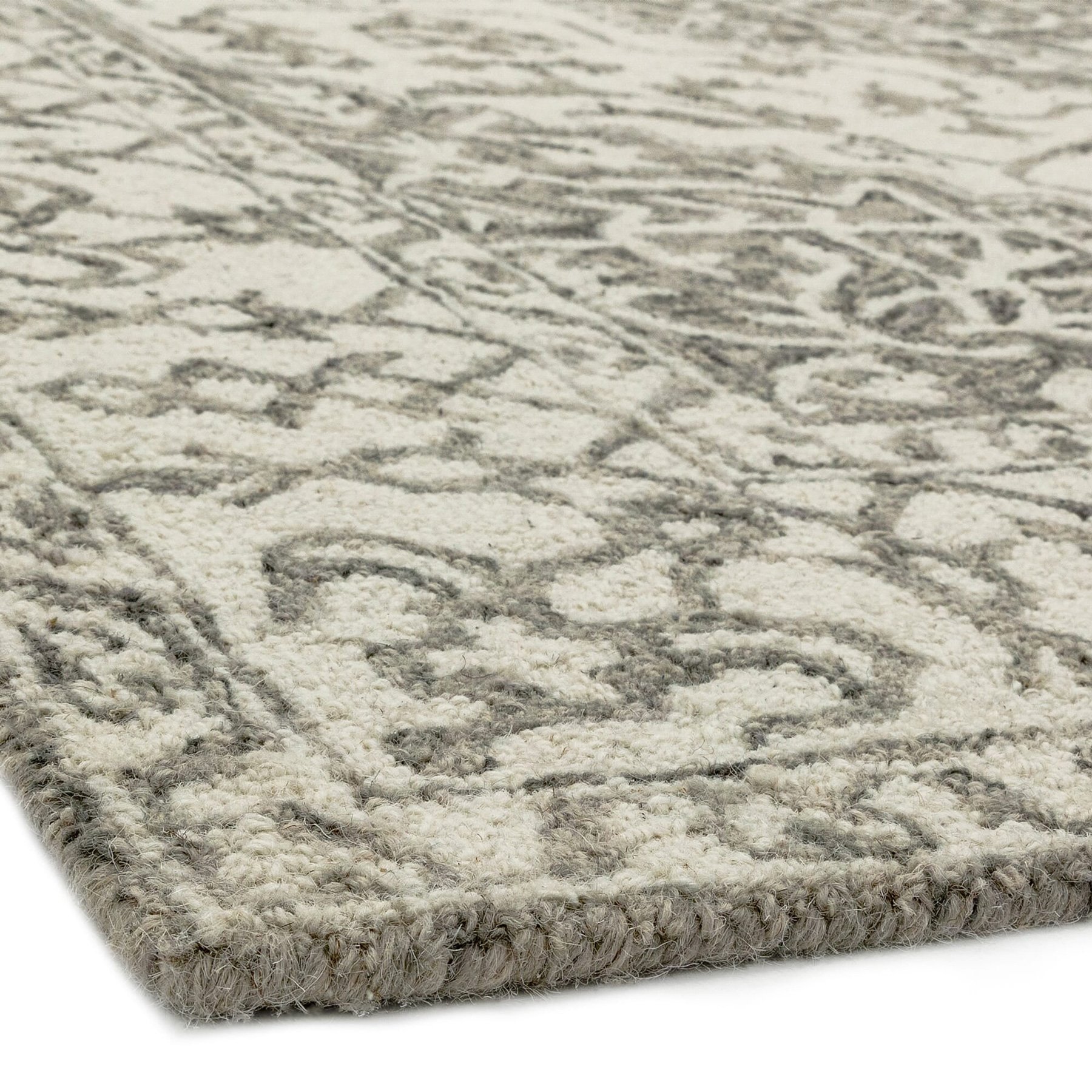 アッシュグレー色の、伝統的なペルシャ絨毯のデザインをモチーフに、ニュートラルモダンな色調で仕上げた、天然素材ウール100%製RUGHAUSの手織りハンドメイドラグ Emblaの素材感がわかるクロースアップ