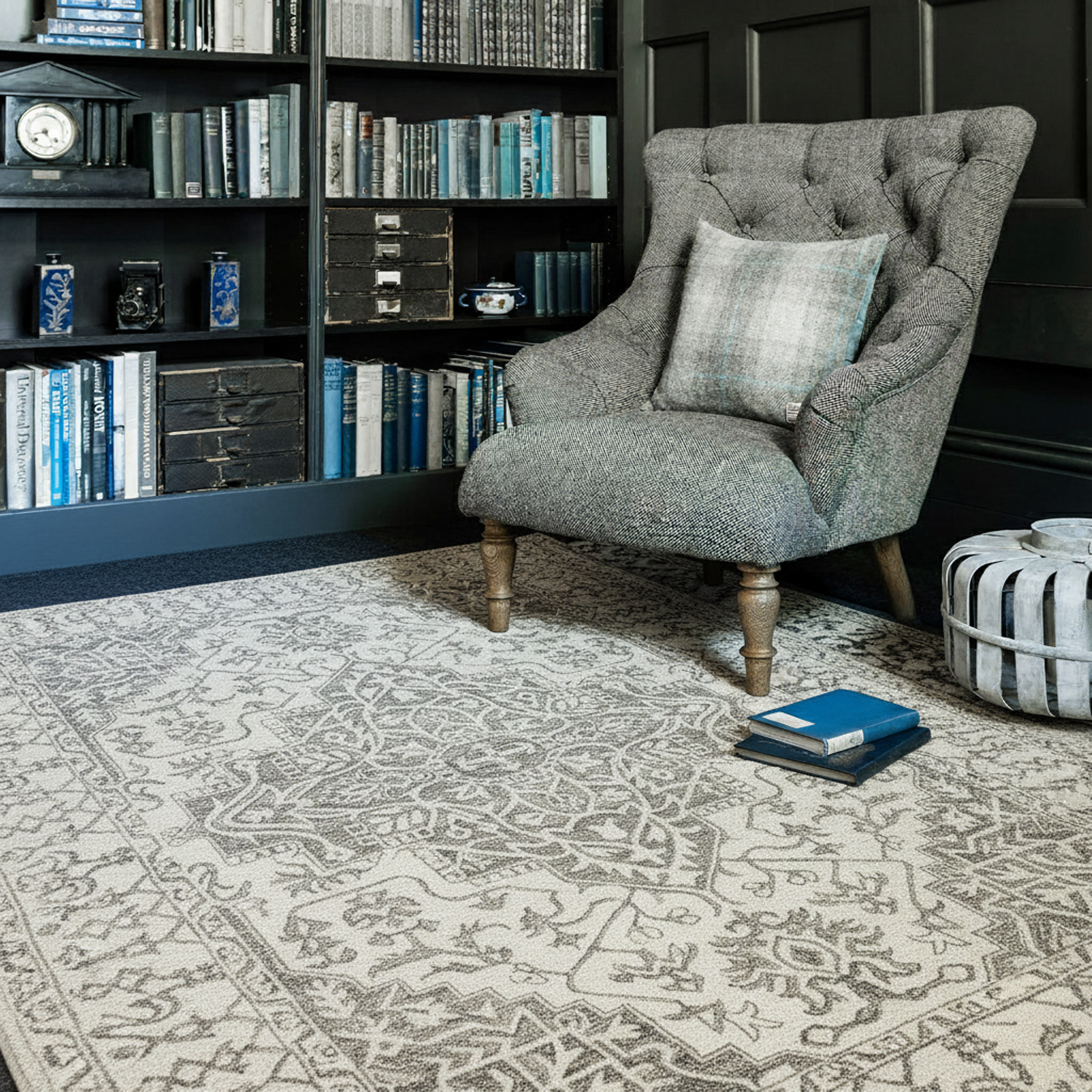 160x230cmサイズで、アッシュグレー色の、伝統的なペルシャ絨毯のデザインをモチーフに、ニュートラルモダンな色調で仕上げた、天然素材ウール100%製RUGHAUSの手織りハンドメイドラグ Embla
