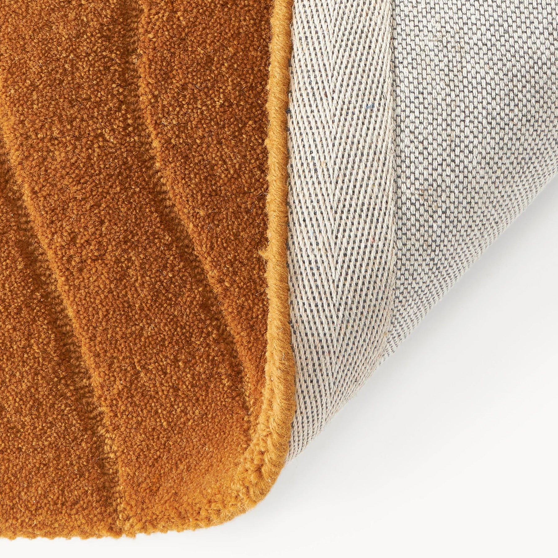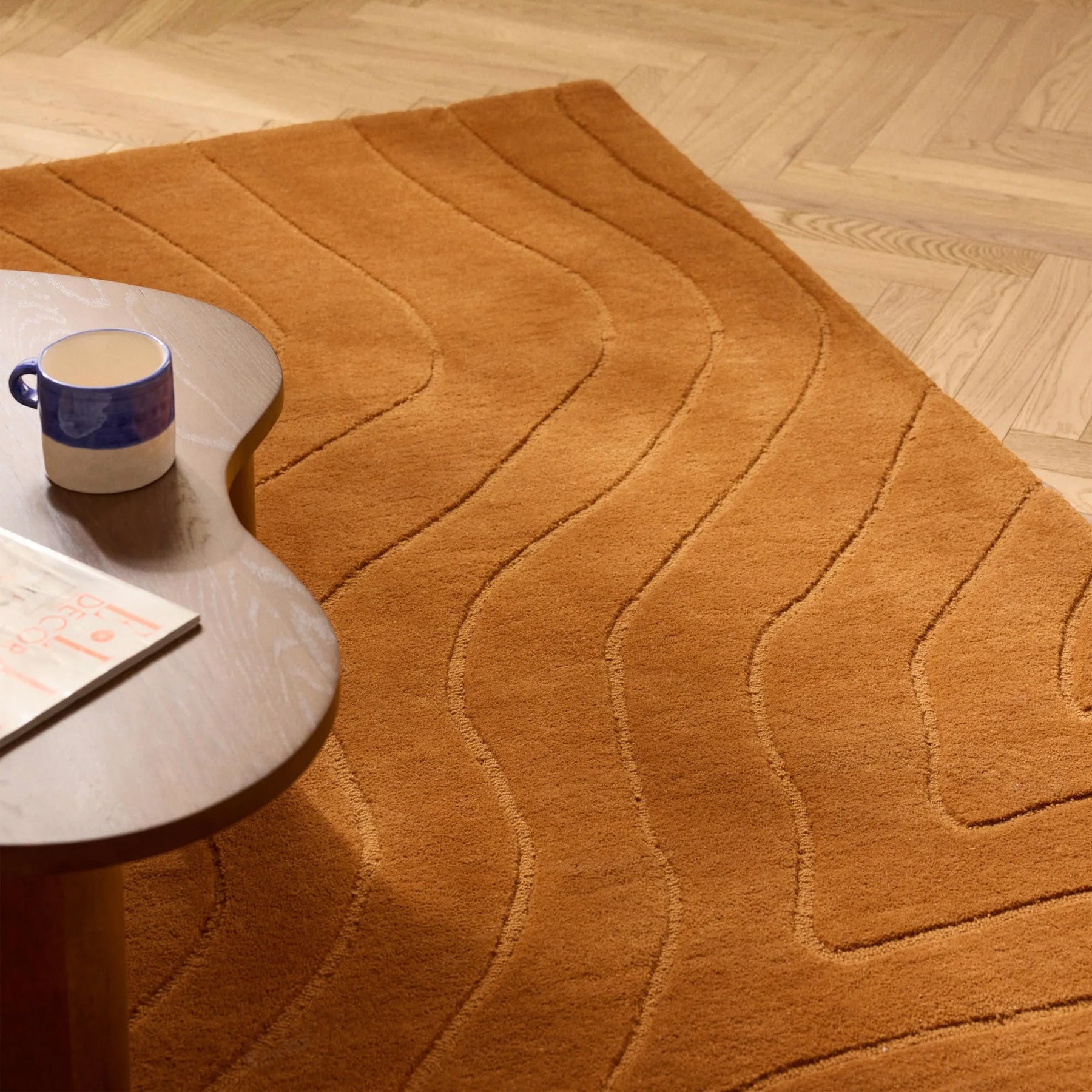 素材はマイクロファイバーポリエステル。極細の繊維を起毛させて作った、極上の触り心地。防汚性に優れ、お手入れも簡単。ハンドタフト製法によるほどよい厚みと柔らかさがあり、床暖房にも対応しています。