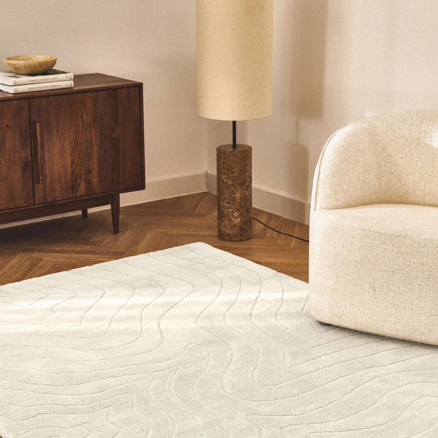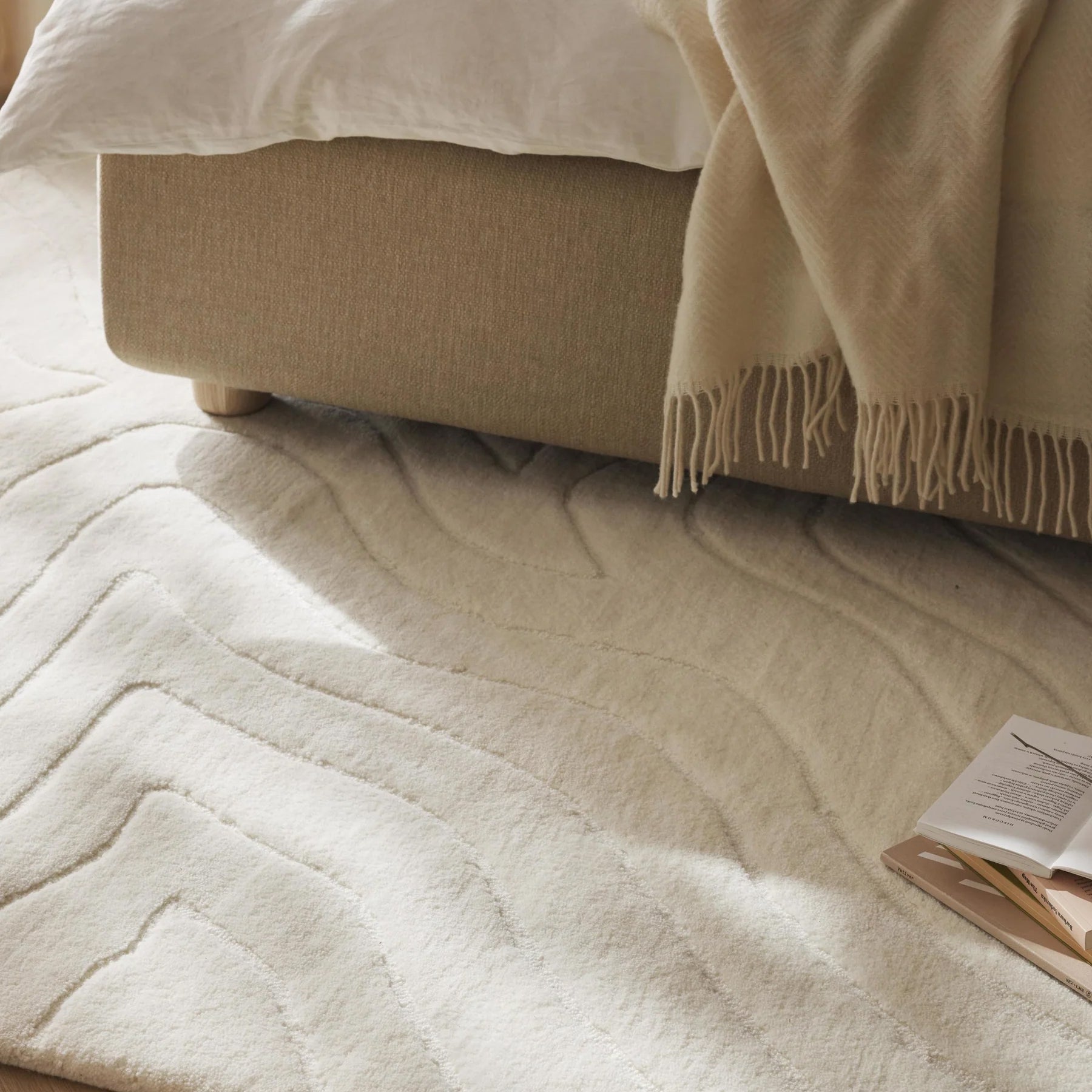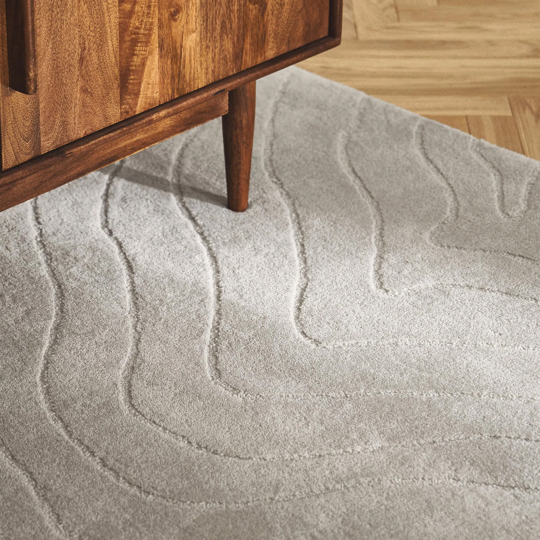 柔らかくうねる立体的なパターンが、光の角度によって表情を変えるデザインです。
