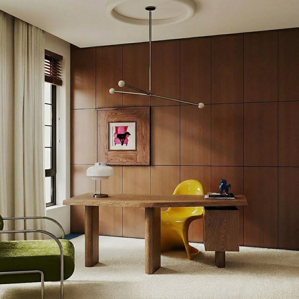 ファッショナブルなバーミリオンオレンジに近いブリックカラー × ベージュの配色と、無機的なフォルムのデザインがスタイリッシュなRUGHAUSの天然素材ウール100%ハンドタフトのモダンポップアートラグを主役にしたモダンなリビングルームイメージ
