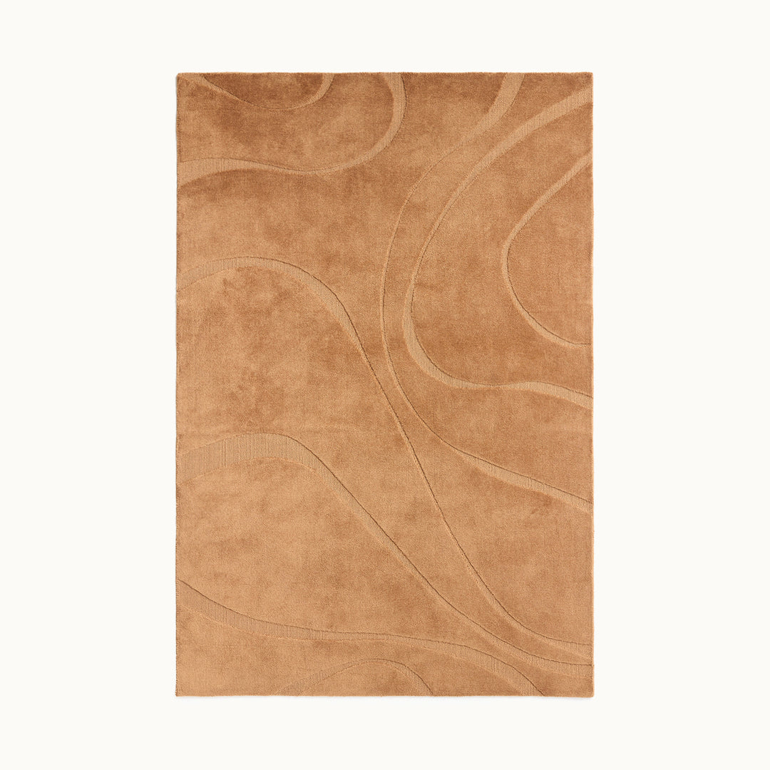 ベージュ色の、スタイリッシュなリブボーダーをパイルの凹凸で表現した、ベルベットのような滑らかな肌触りのRUGHAUSの無地のシンプルモダンラグ Bodilを主役にしたホテルライクなリビングルーム