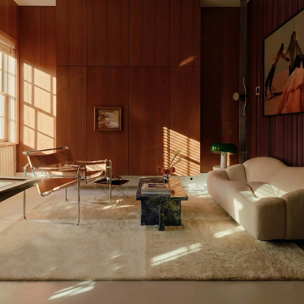 シルクのように上品な艶感としっとり滑らかな肌触りが特徴のビスコース100%製ハンドメイドのサンドベージュ色が美しいRUGHAUSシンプルモダンラグを主役にしたナチュラルシックなリビングルームイメージ