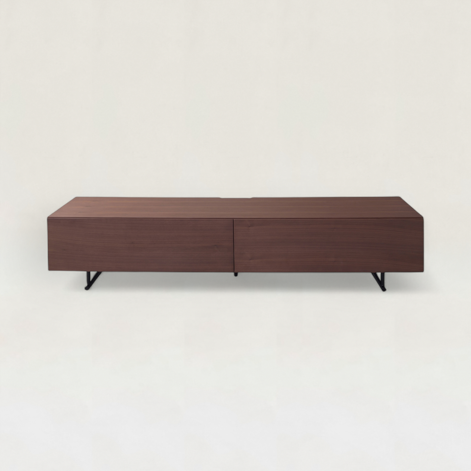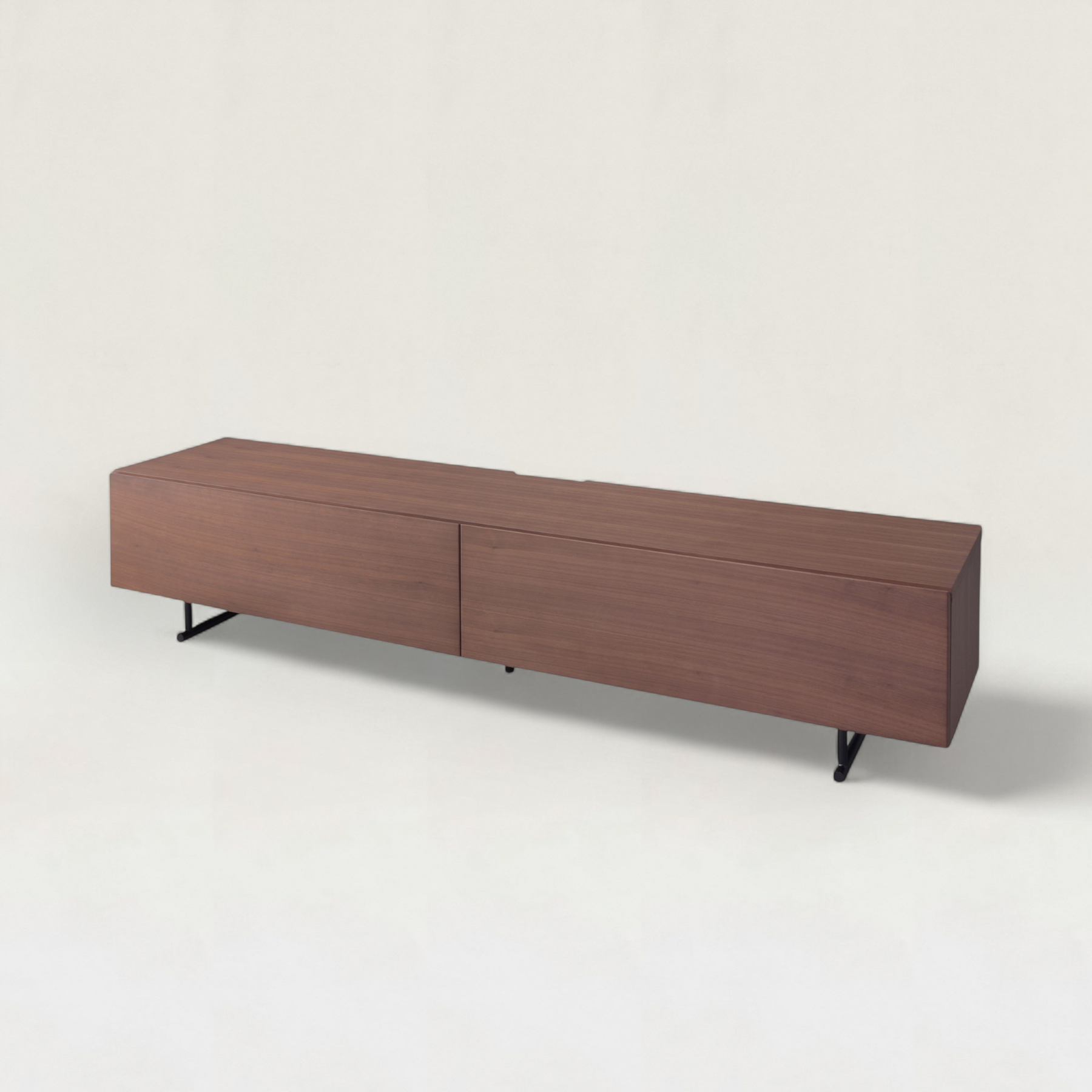 重厚感のある木目に優しく包まれたTVボードは、リビングの中心に自然と落ち着きをもたらします。引き戸の奥にリモコンやAV機器をすっきりと収納でき、操作性にも配慮された設計となっています。
