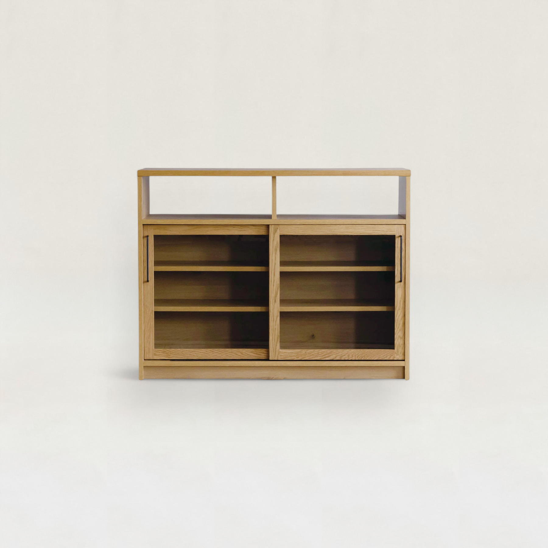 木の温もりを感じさせるナチュラルな佇まいと、マットブラックのスチールが織りなすレトロな表情が印象的な収納家具です。上部のオープン棚にはお気に入りの雑貨や小物をさりげなく飾り、下部の収納部には埃を避けたいアイテムをすっきりと整えることができます。