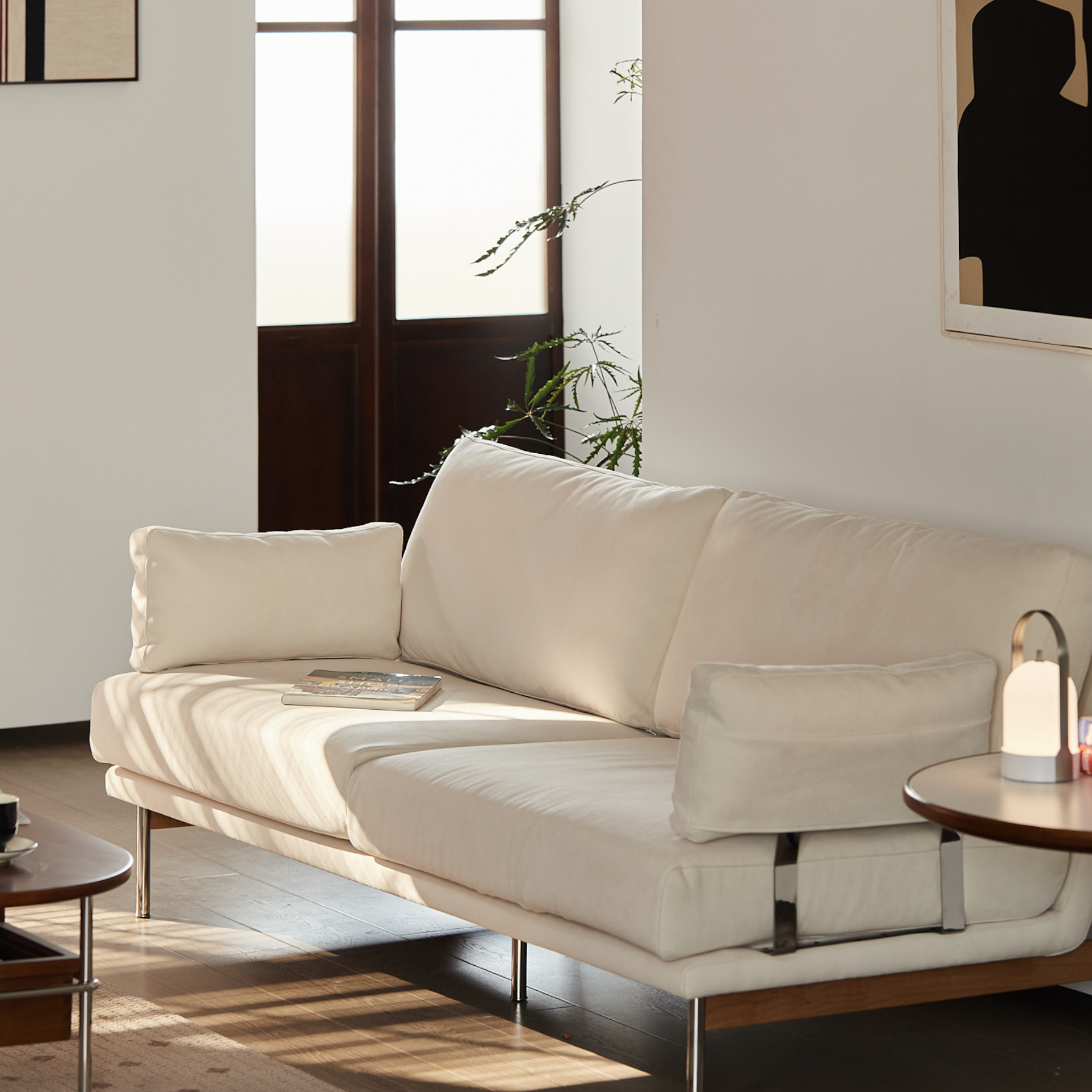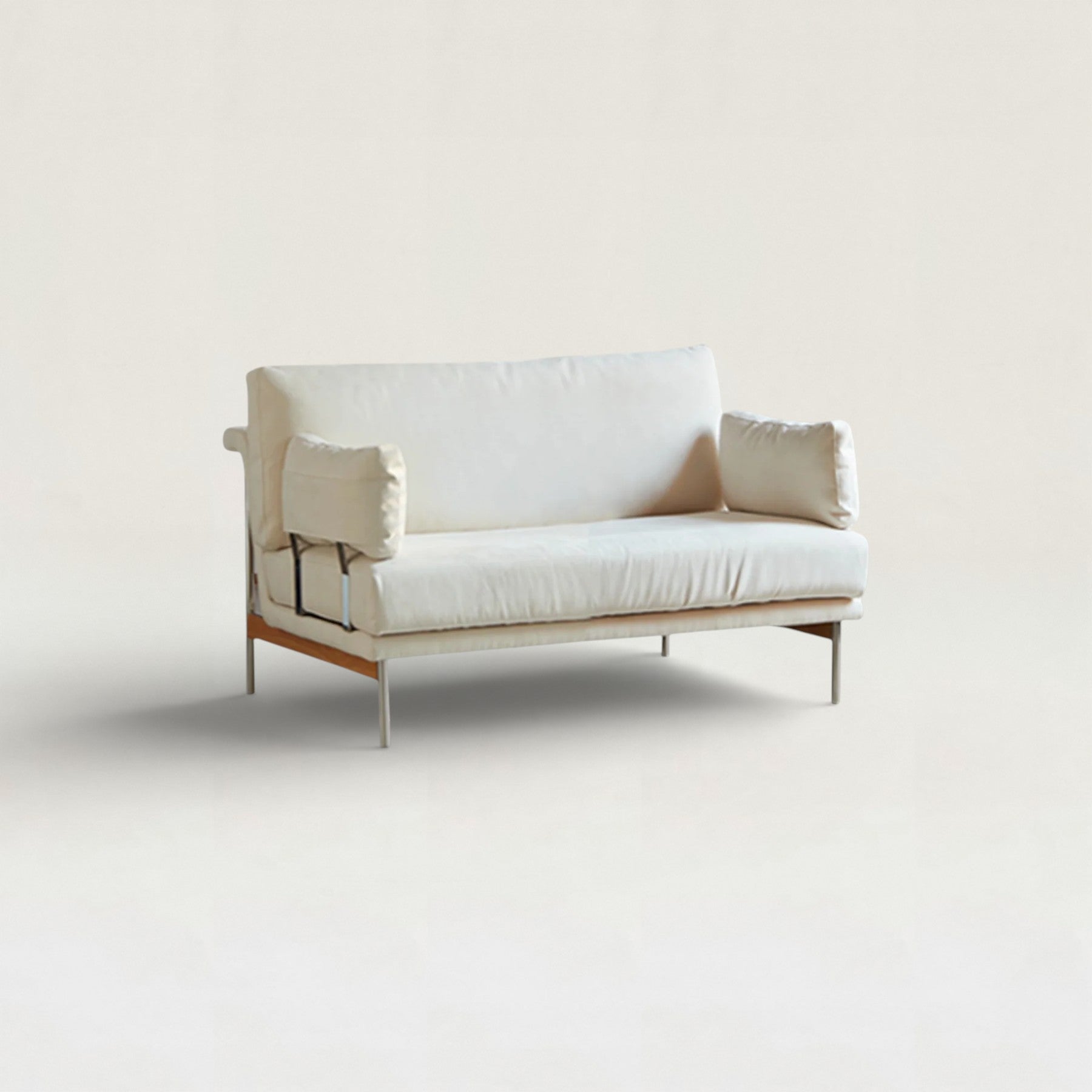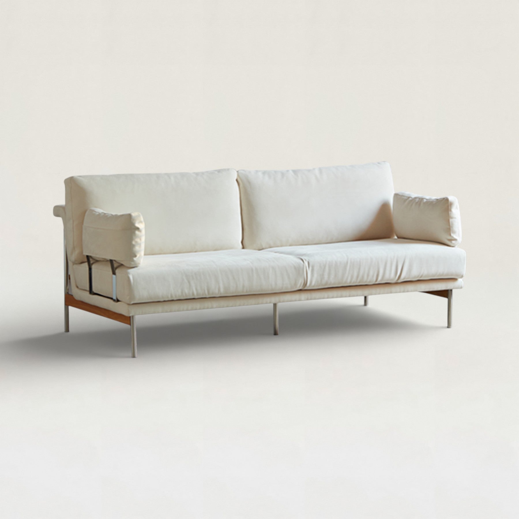 細身のウッドフレームとやわらかなクッションが調和した、軽やかな印象のソファ。