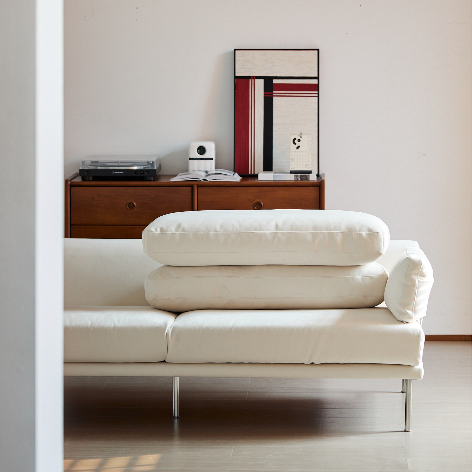 両サイドのクッションは取り外し可能で、アームレストとしても抱き枕のようにも使えるため、暮らしのシーンに合わせて柔軟にお使いいただけます。