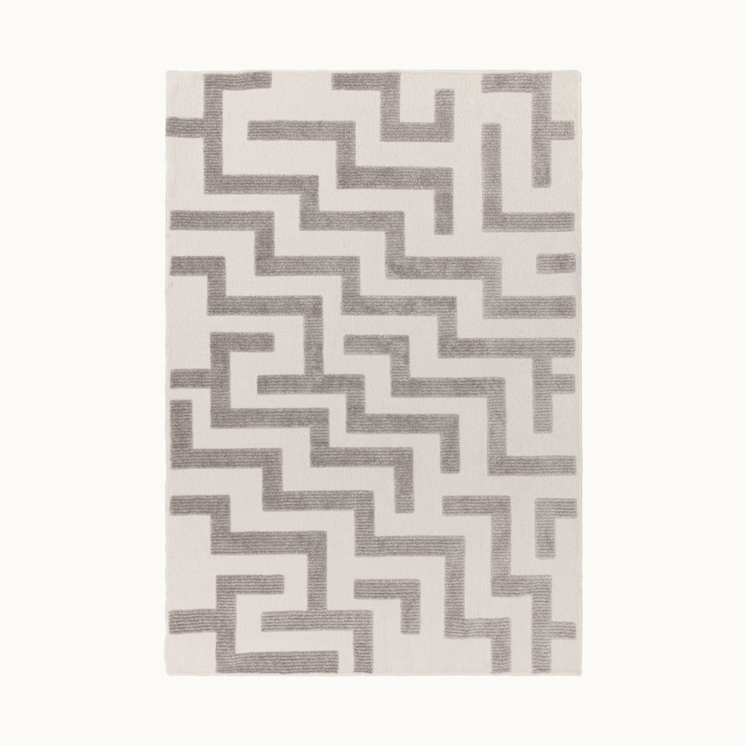 200x290cm大きめサイズのスタイリッシュなグレーカラーと幾何学的パターンがアーティスティックにマッチした、ふわふわと手触りのいい、ポリプロピレンとポリエステル混合のRUGHAUSのコンテンポラリーアートラグ