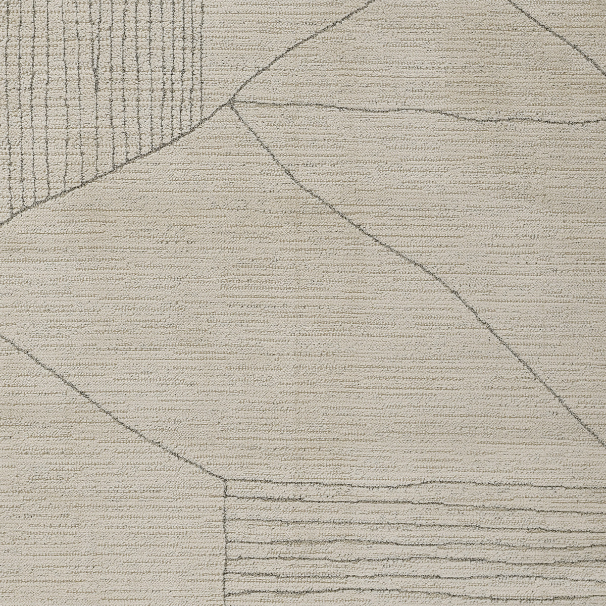 ナチュラルなアイボリー地 × ゆるりとしたミニマリズムをテーマに、三角のフォルムやボーダー、チェックパターンを自由かつ絶妙なバランスで織り込んだ、RUGHAUSのポリプロピレン・ポリエステル製ベニワレンスタイルのナチュラルデザインラグの素材感がわかるクロースアップ