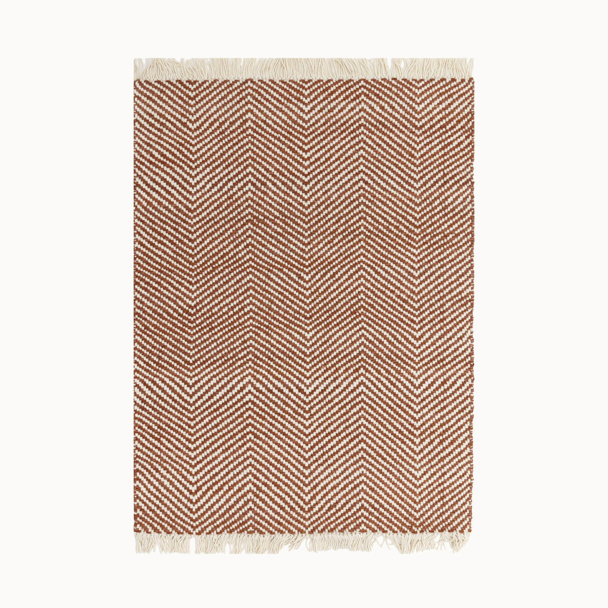 200x290cmサイズのラスティレッドのジグザグパターンとフリンジでナチュラルなBOHOスタイルを演出した、サステナブルな天然素材ジュート(麻)とコットン製RUGHAUSの厚みのある手織りラグ