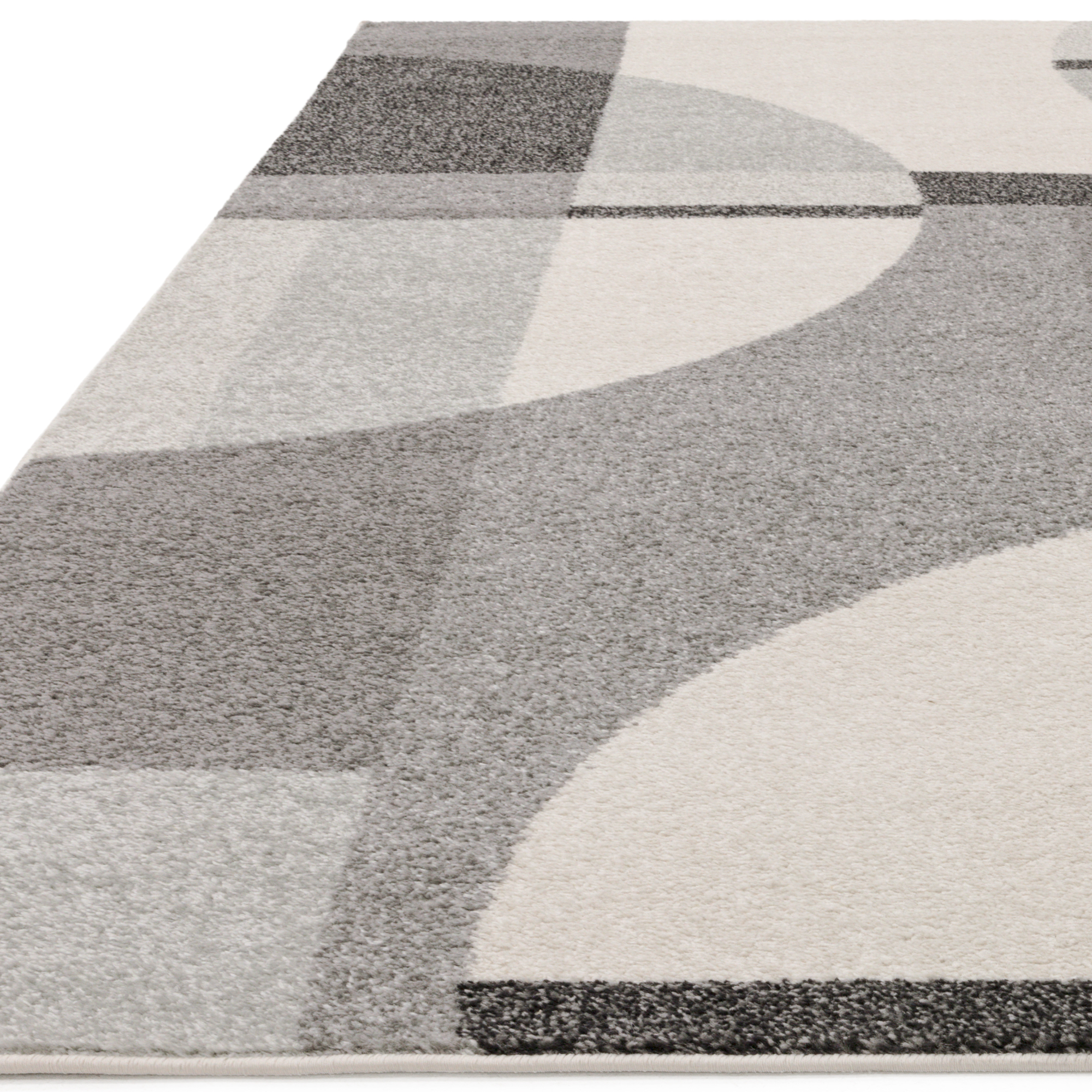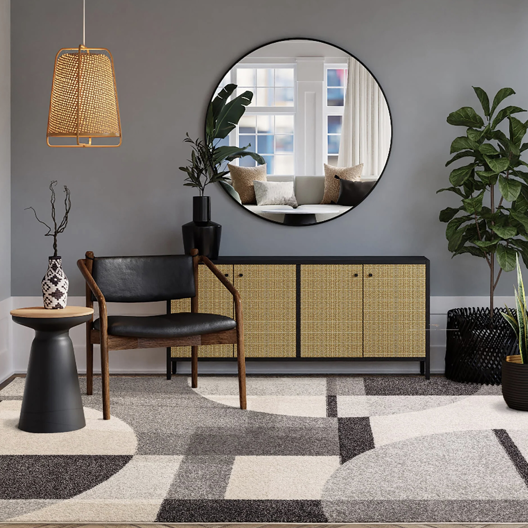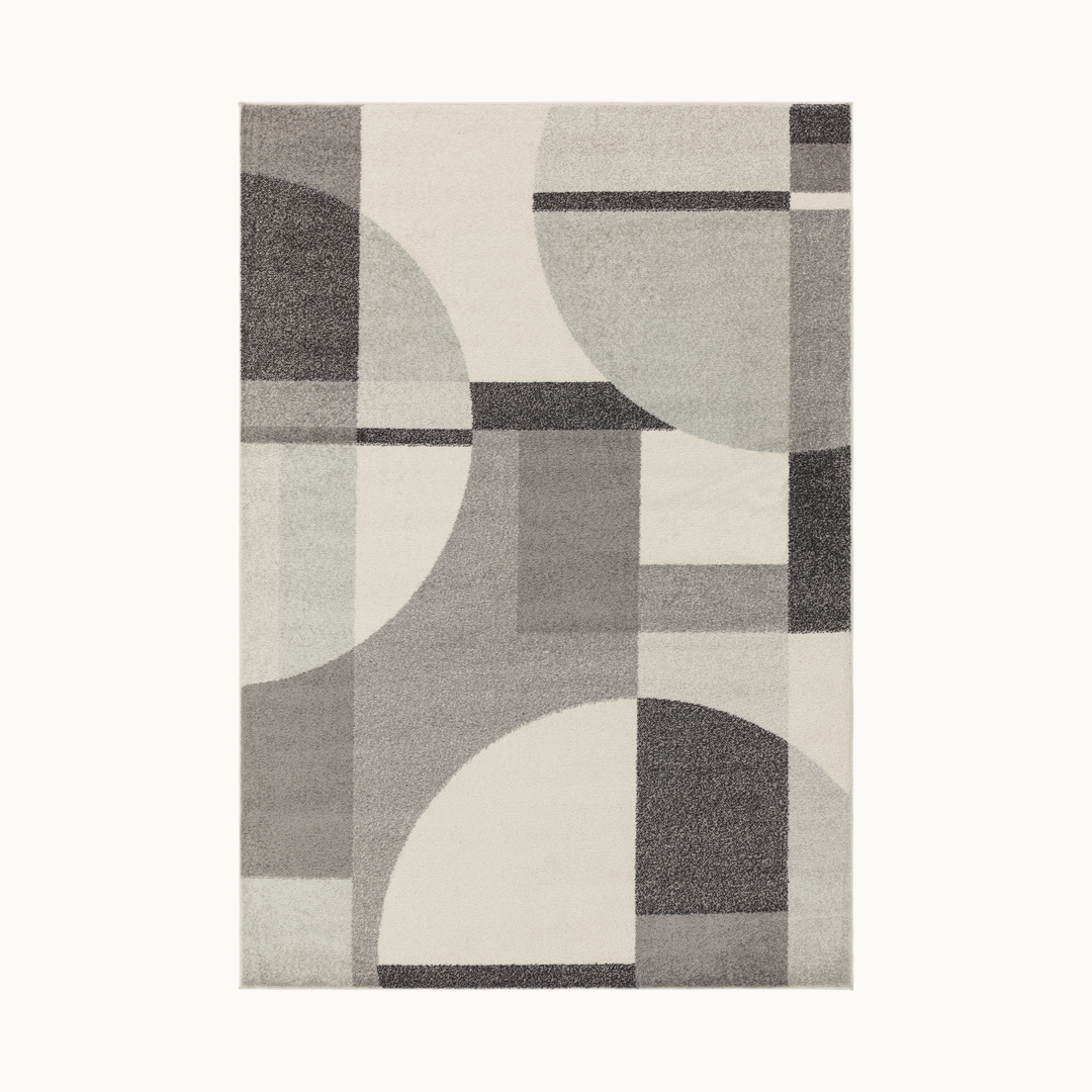 交錯する円や四角いフォルムとモノクロームの配色が、独特な世界観を織り成すレトロモダンなアートラグです。