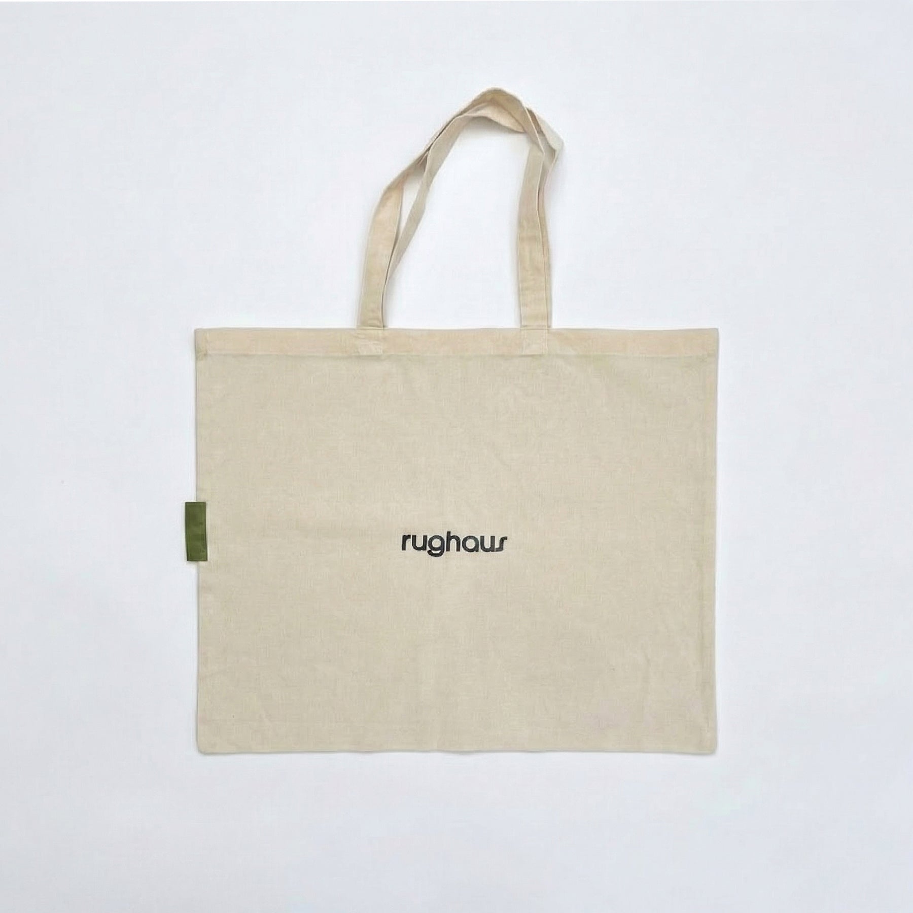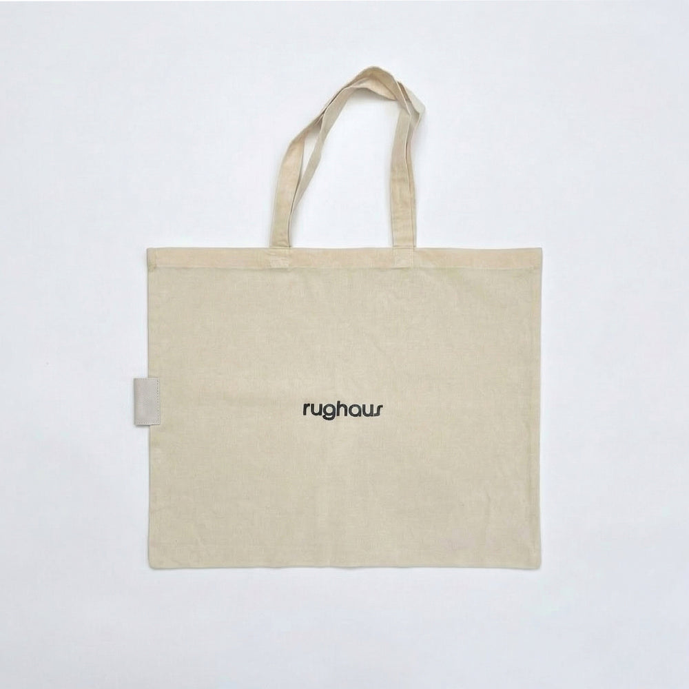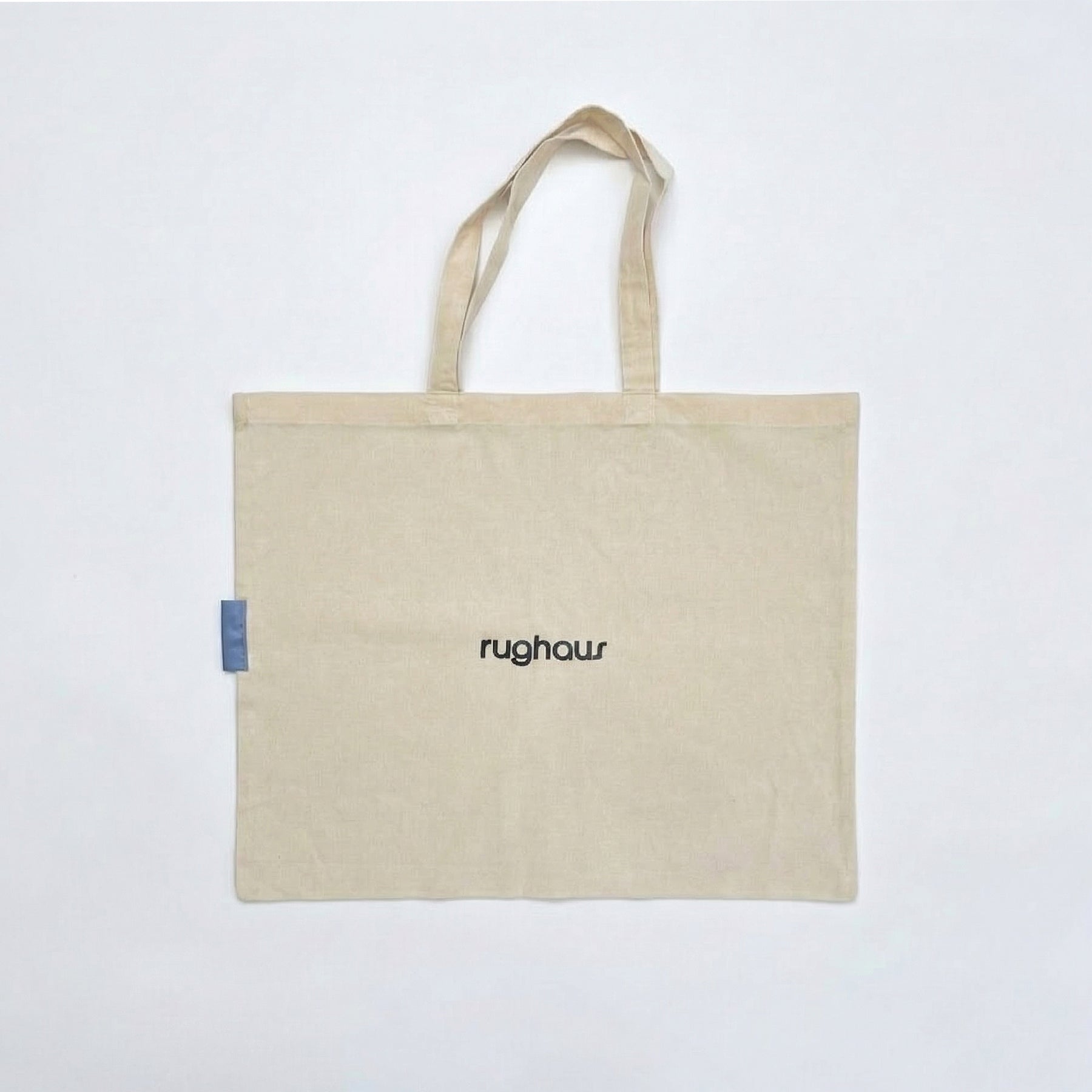 シンプルで大判なトートバッグ。サイドに、ベッドリネンの生地で作成されたタグが付いています。